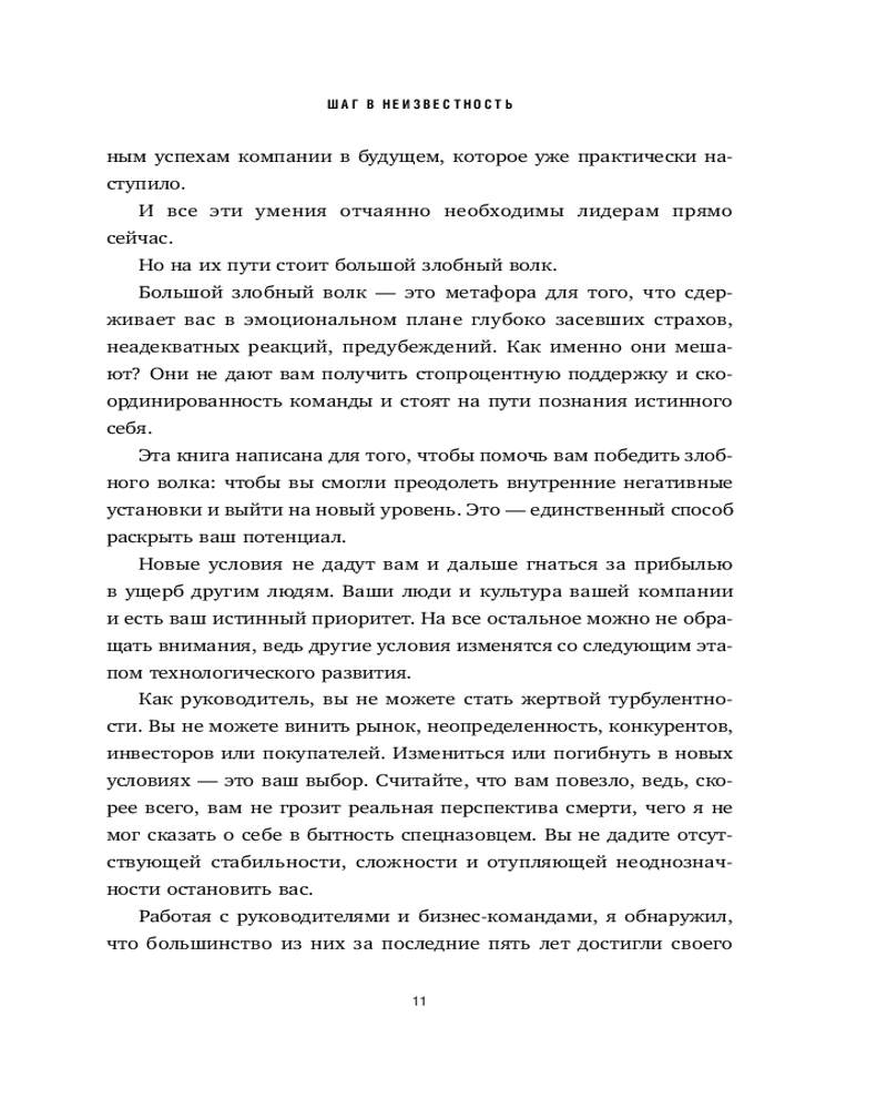 Загляни в глаза волка. 7 принципов настоящего вожакаВ данный момент этот товар отсутствует в продаже. Возможно, у нас найдется аналогичный или похожий товар здесь. Серия: Психология. Искусство лидера Быть первым среди равных. Настоящим вожаком в стае талантливых и амбициозных. Тем, кто ведет за собой во времена потрясений и перемен. Что для этого нужно? Марк Дивайн уверен, в здоровой команде главный — не тот, у кого самые острые зубы, а тот, кто способен придерживаться 7 принципов: храбрости, доверия, уважения, роста, развития, стойкости и контакта. За плечами Марка 20 лет командования морпехами, больше 25 лет предпринимательства и 10 лет работы в качестве бизнес-коуча. Он точно знает, что нужно, чтобы стать психологически сильным и устойчивым самому и сделать свою команду такой же. |