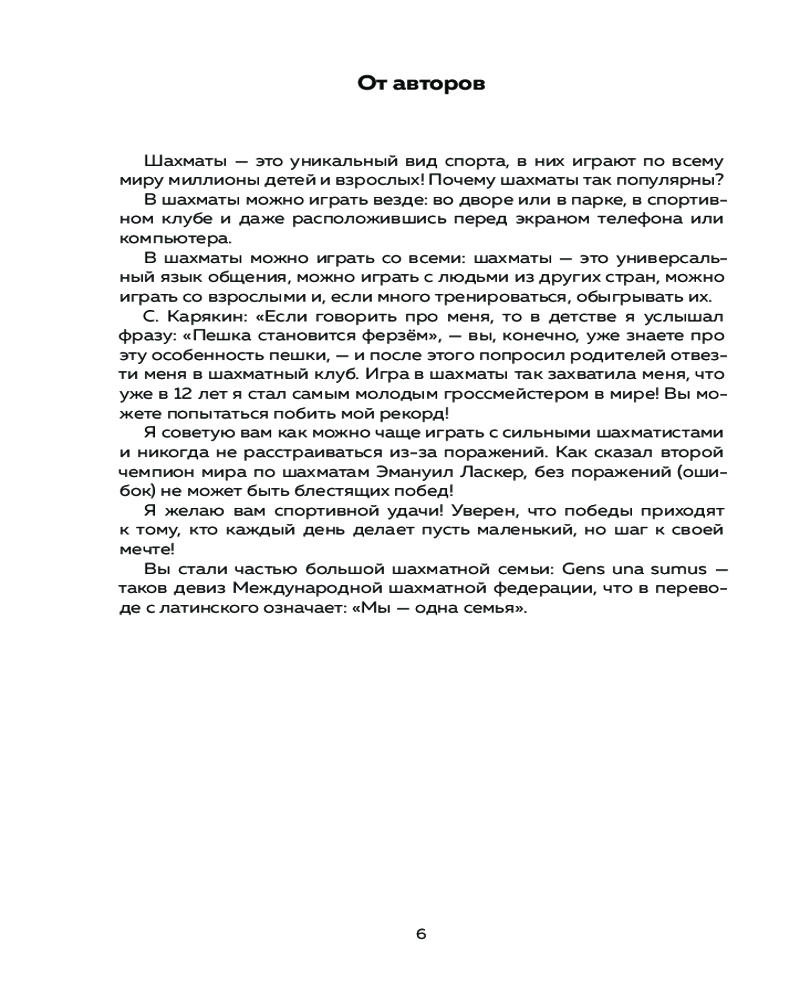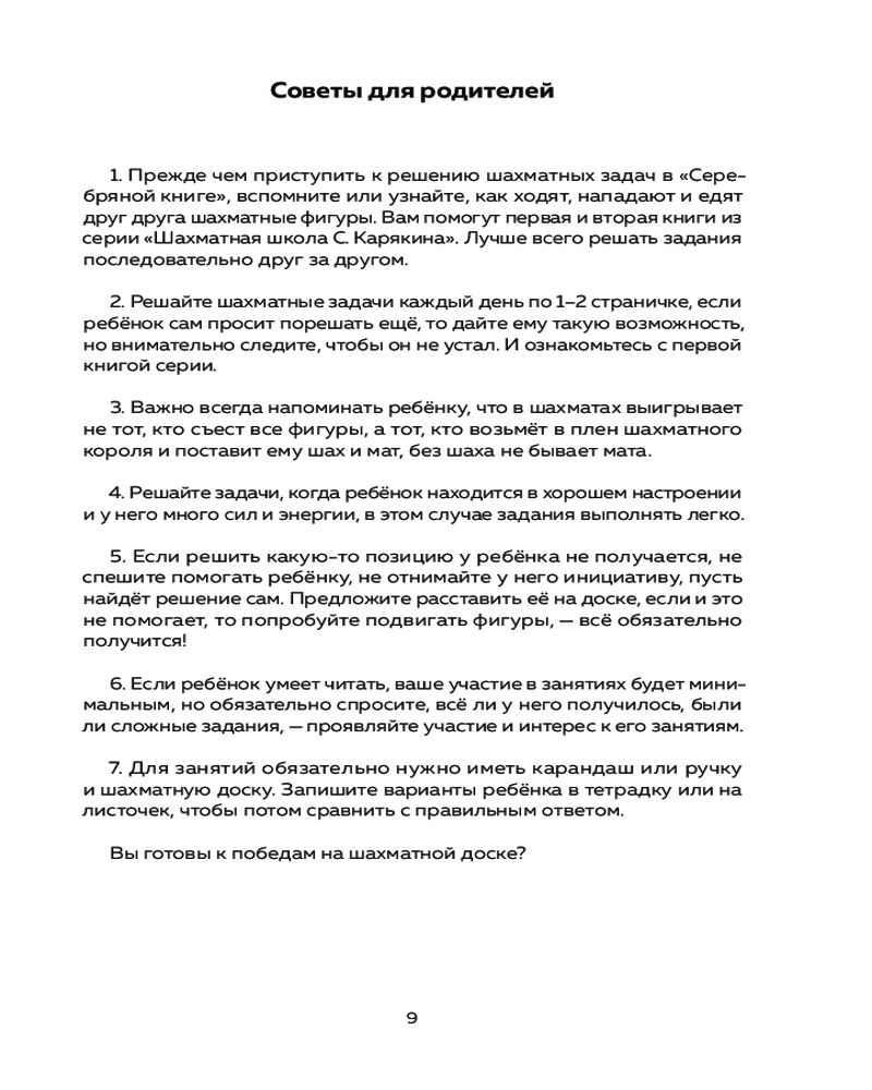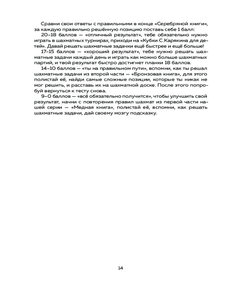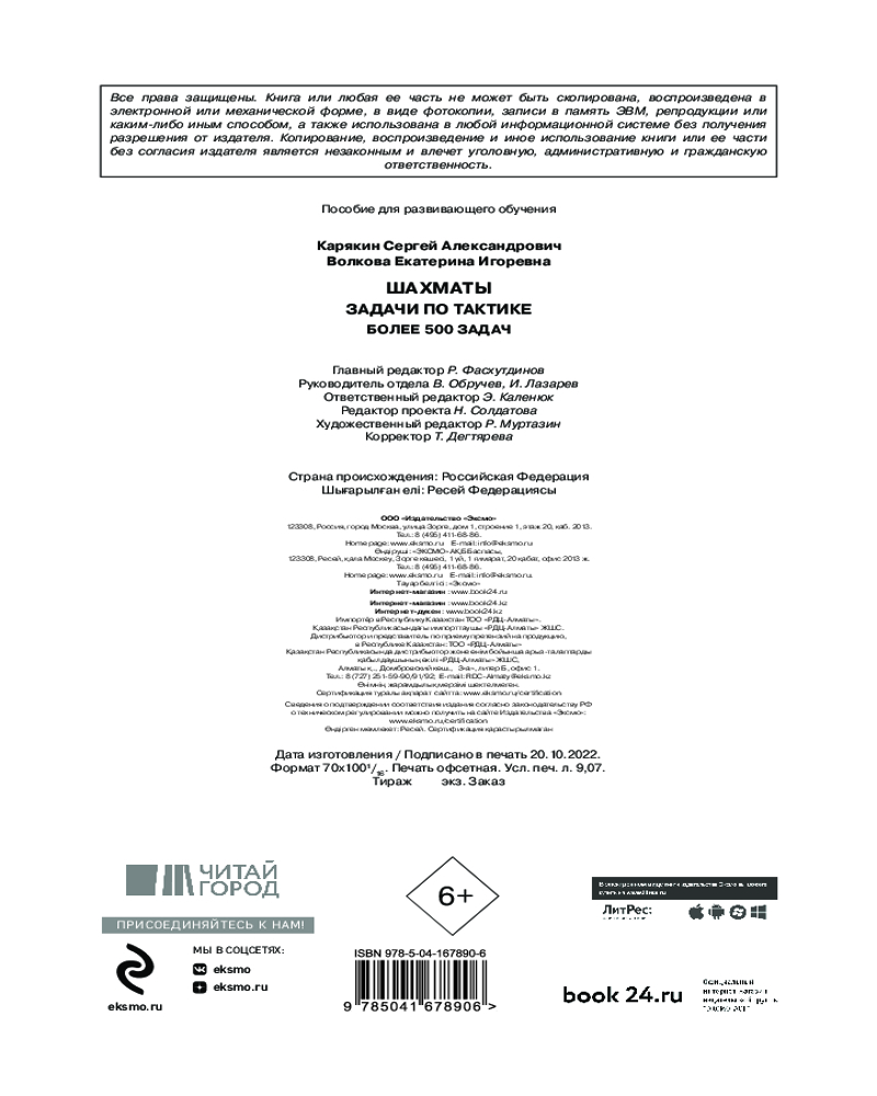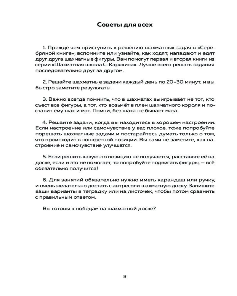 💳 Оплатить за товар можно при получении 🇰🇿 Есть бесплатная доставка по Казахстану 🎁 Копите бонусы с каждой покупки Серия: Шахматная школа Сергея Карякина. Обучающие задачники от известного гроссмейстера «Задачи по тактике» — третья книга серии шахматных задачников ведущего шахматиста мира Сергея Карякина. Задачник содержит более 500 заданий на закрепление знаний на мат в один и два хода и выигрыш материального преимущества. Для удобства юных шахматистов все упражнения расположены по возрастанию сложности, помогая разобраться в простых тактических приемах, чтобы уверенно чувствовать себя во время шахматной партии. Книга-задачник подходит для занятий в школах, кружках, спортивных школах и самостоятельно дома с родителями. |
