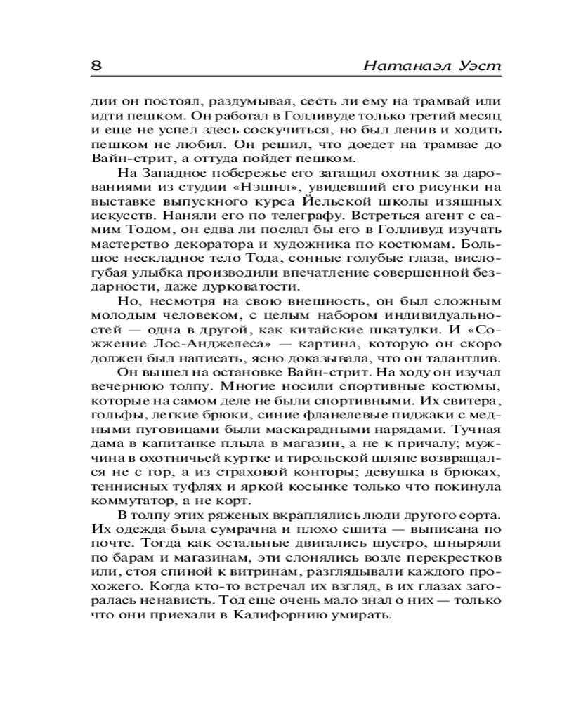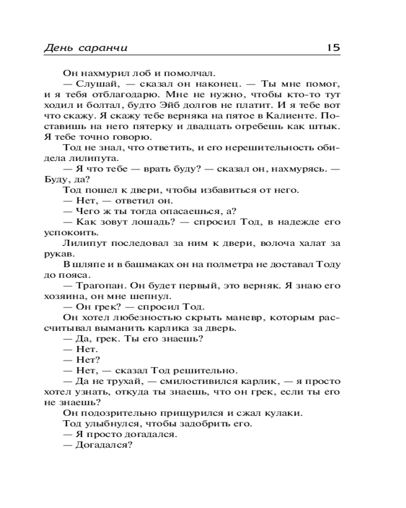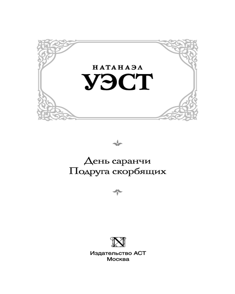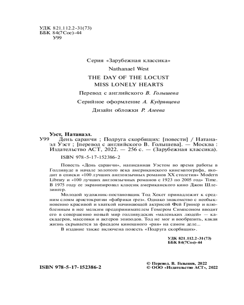 Серия: Зарубежная классика Повесть «День саранчи», написанная Уэстом во время работы в Голливуде в начале золотого века американского кинематографа, входит в списки «100 лучших англоязычных романов ХХ столетия» Modern Library и «100 лучших англоязычных романов с 1923 по 2005 год» Time. В 1975 году ее экранизировал классик американского кино Джон Шлезингер. |