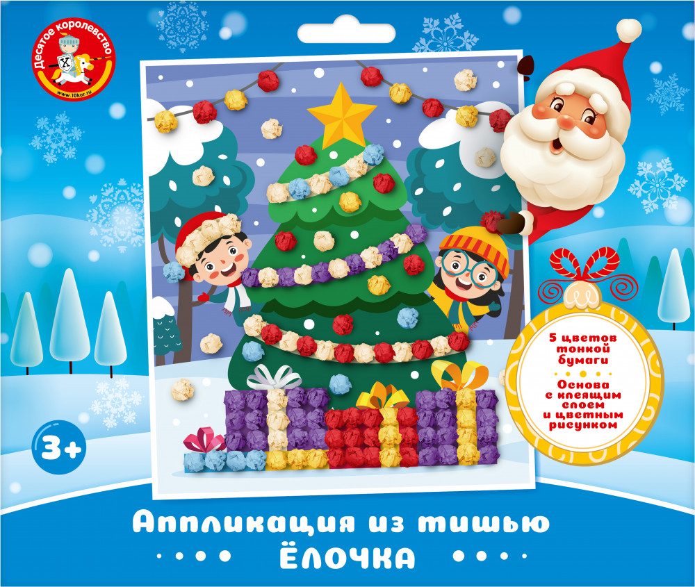 Набор для детского творчества Аппликация из тишью «Ёлочка» состоит из картонной основы с ярким изображением и специальным клеевым слоем и листов цветной бумаги тишью. Бумага тишью — это тонкая нежная декоративная бумага разных оттенков. Комкая небольшие листочки и приклеивая их на основу, малыш развивает мелкую моторику, усидчивость и творческое мышление. Оригинальная поделка станет украшением комнаты ребенка или оригинальной новогодней открыткой.