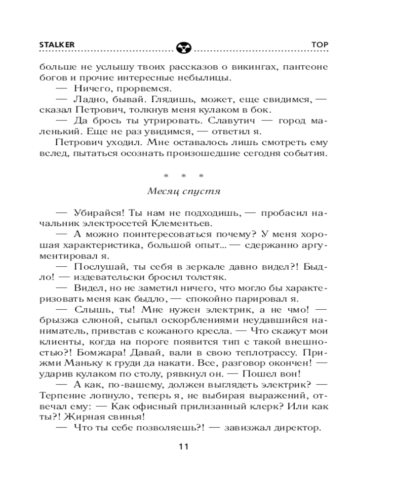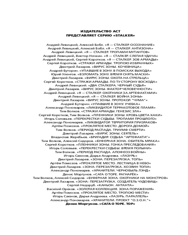 Сага о Торе. ТорВ данный момент этот товар отсутствует в продаже. Возможно, у нас найдется аналогичный или похожий товар здесь. Серия: Stalker Из-за конфликта с местным депутатом жизнь на Большой земле стала небезопасной для Андрея Томашевского. Скрываясь от «братков», посланных разобраться с ним, Андрей обращается к коллеге — к бывалому в прошлом сталкеру Петровичу. Заручившись поддержкой товарища, он проникает в Зону. Андрею предстоит пройти долгий и опасный путь, преодолеть множество испытаний, не раз взглянуть смерти в лицо, вновь встретиться со своими преследователями и в конце концов поставить точку в этой охоте. |