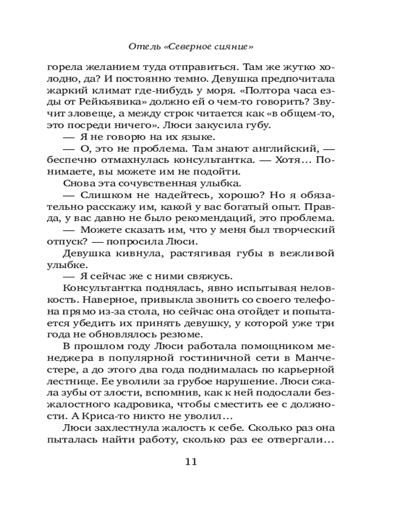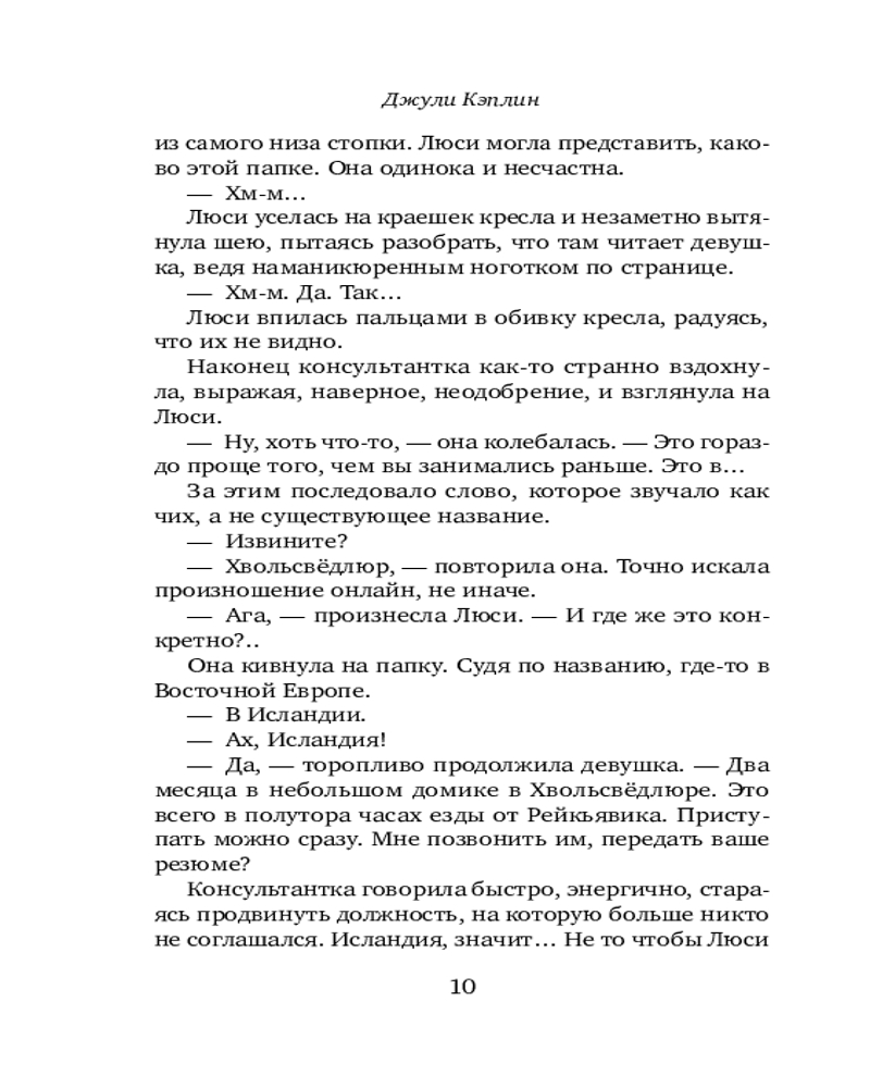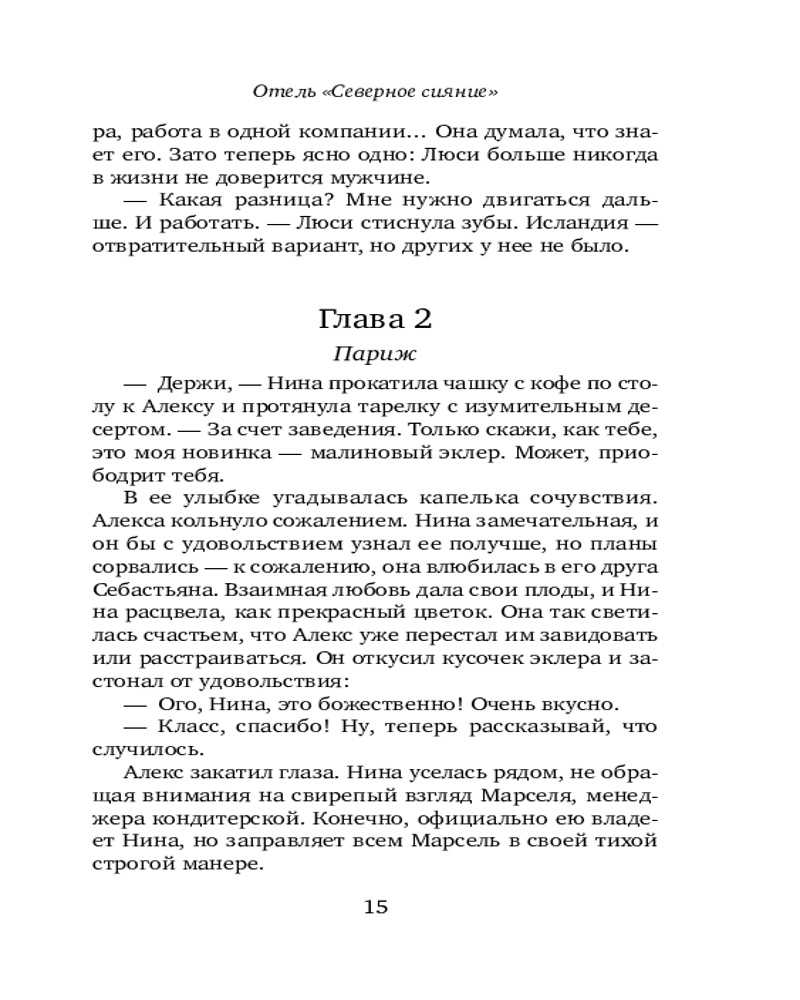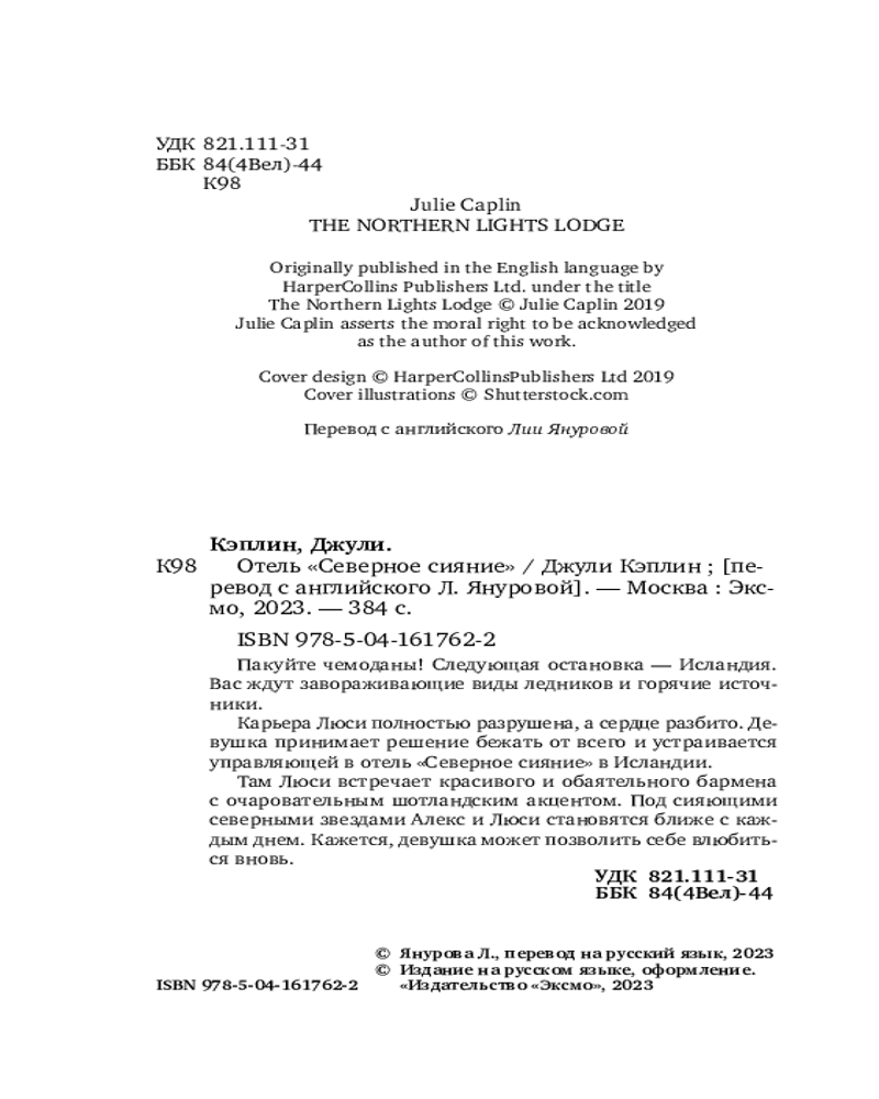 «Отель Северное сияние» Джули Кэплин (“The Northern Lights Lodge”, Julie Caplin) ✨✨✨ Количество страниц: 384 «…В тёмном небе волнами переливалось изумительное зелёное сияние… Загадочный волшебный свет пролился на пейзаж, обнажая море, что билось о скалы, и окрашивал их в причудливые цвета…». Профессионал своего дела, менеджер крупного отеля в Великобритании, Люси вынуждена отправиться в Исландию для работы в небольшом и малоизвестном месте для туристов. Туда же направляется успешный менеджер отеля в Париже, уроженец Шотландии, Алекс. У каждого из них свои причины и свои тайны. Интригу держит и сам отель в Исландии, где происходят порой странные вещи, объяснимые только местной мифологией. Разочаровавшись во многом, наши герои находят на новом месте вдохновение в работе, друзей и любовь. Обретают уверенность в себе и своих силах. История любви здесь показана очень нежная, трепетная, красивая. 💘 Мне понравилось, что герои не бросились с головой в пучину страсти с первых страниц. Всё сбалансированно. Действия происходят, в основном, на фоне прекрасных пейзажей Исландии и немного Шотландии. Викинги, англичанка и шотландец – это что-то. Для меня это комбо. 😀 Много описаний достопримечательностей и красот природы: северное сияние, горы, море, горячие источники. Местная и культура и колорит. Снег здесь по-своему особенно красив. Книгу хорошо читать перед новогодними праздниками. Я даже успела привязаться к героям произведения. Само повествование хорошее, но, тем не менее, раз уж я пишу честный отзыв, не могу не отметить местами косноязычность и корявенький перевод, при том, что некоторые моменты в романе описаны превосходно. Сложно сказать, в чём тут причина. Ещё при чтении проскакивала такая мысль, что есть книги из этого жанра интереснее, милее, уютнее, но, всё-таки, я пришла к выводу, что и этот роман имеет свою изюминку. Скажу так: для внутреннего содержания книга дороговата по цене, но однозначно не жалею, что купила и рекомендовать буду. Очень красивая обложка из тонкого лощёного картона, но боковушки внутри излишни, я считаю. Переплёт не очень крепкий, быстро стал расклеиваться. Страницы тонкие, серые. Шрифт крупный, чёткий, удобный для чтения. Формат чуть меньше среднего. Издательство: Москва: Эксмо, 2023. Перевод с английского Лии Януровой.