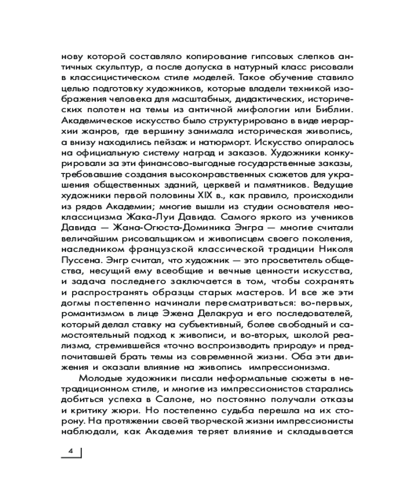 Эта новаторская живопись света и цвета, сохраняющая свежесть первого впечатления и легкая для восприятия, получила признание и любовь миллионов людей во всем мире. Снабженная множеством красочных иллюстраций, этот мини-альбом рассказывает о том, как зародилось это направление в искусстве, какие сюжеты вдохновляли художников, повествует об их жизненном пути, а также рассказывает о творчестве художников постимпрессионистов, так или иначе попавших под влияние импрессионистов: Поле Гогене, Поле Сезанне, Винсенте Ван Гоге. |