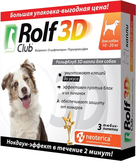 RolfClub 3D Капли на холку для собак от блох, клещей, насекомых (10-20 кг)-20% +268