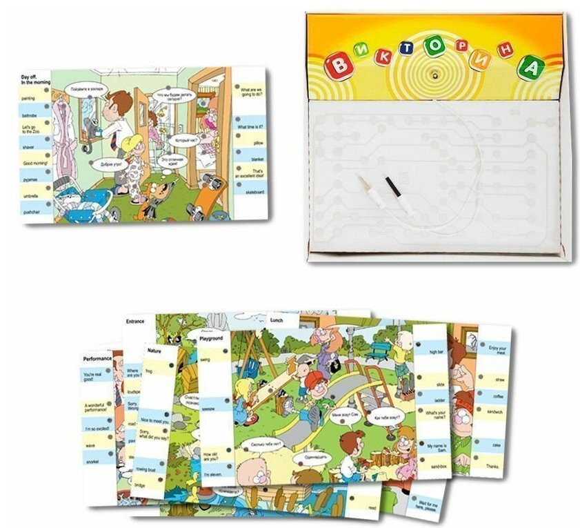 В электровикторине игрок с помощью проводящих ток проводков ищет правильные ответы на вопросы. Один проводок прикладывают рядом с вопросом, а второй — рядом с предполагаемым ответом. Если ответ правильный, электрическая схема замкнётся, загорится лампочка и зазвучит музыка. Благодаря игре ребята узнают более 200 английских слов и 50 выражений. В словарике приведён список использованных английских слов и выражений, английская и русская транскрипции, русский перевод. С одной стороны карточки информация приведена на двух языках — русском и английском. Игрок должен прочитать по-русски и найти правильный английский перевод. С другой стороны карточки всё написано по-английски, а игрок должен постараться понять, что ему нужно делать. Игра поможет ребёнку достичь значительных успехов в освоении английской разговорной речи. |
