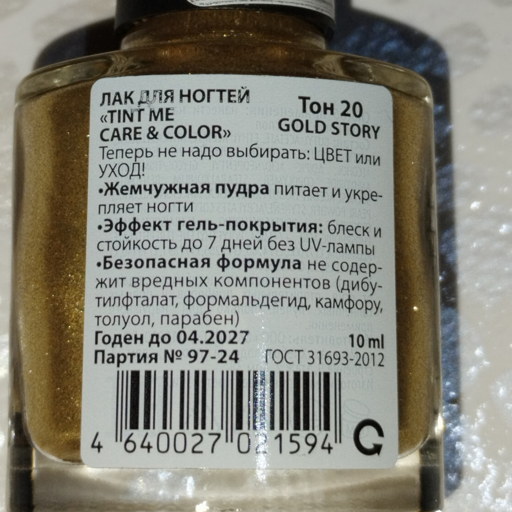 Лак для ногтей «Tint Me Care&Color». Теперь не надо выбирать: Цвет или уход! Новый взгляд на лак для ногтей — профессиональный цветной уход за ногтями. Средство объединяет лучшие свойства цветного покрытия и укрепляющего средства. Жемчужная пудра питает ногти. Уникальный состав обеспечивает эффект гель-покрытия: блеск и стойкость до 7 дней без UV-лампы. Безопасная формула не содержит вредных компонентов (дибутилфталат, формальдегид, камфору, толуол, парабен). Теперь полезное с модным сочетается в одном флаконе!