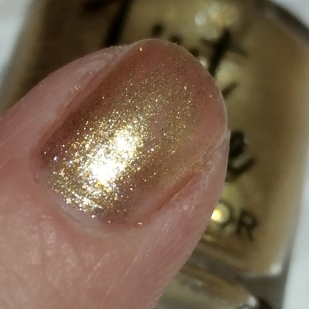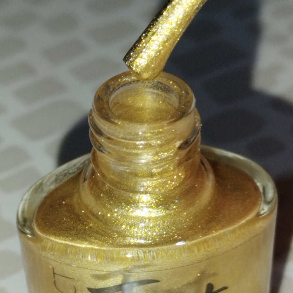 Золотой цвет, с мелкими блестками, которые переливаются на солнце. Быстро высыхает. Немного полосит, но на 3 слоя красиво получается.