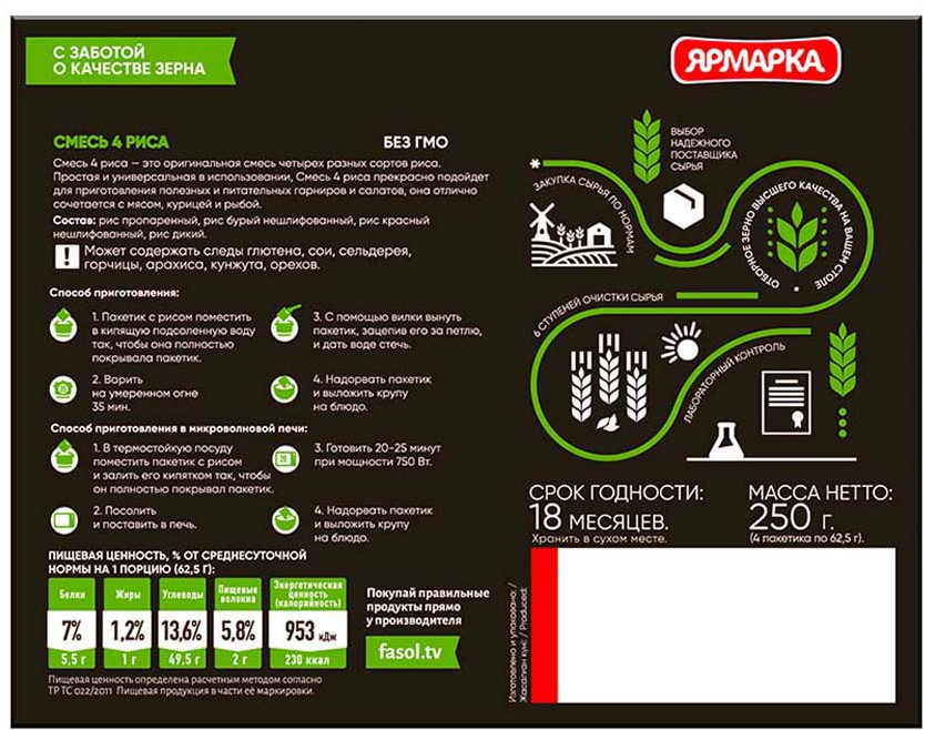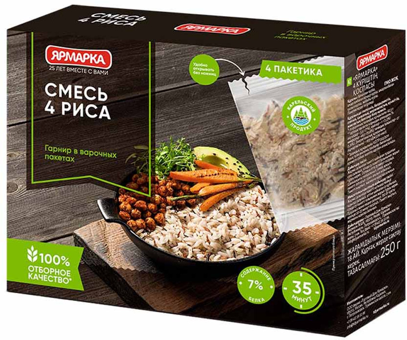 Ярмарка Смесь в варочных пакетах «4 риса»В данный момент этот товар отсутствует в продаже. Возможно, у нас найдется аналогичный или похожий товар здесь. Смесь 4 риса — это оригинальная смесь четырех разных сортов риса. Простая и универсальная в использовании, смесь 4 риса прекрасно подойдет для приготовления полезных и питательных гарниров и салатов, она отлично сочетается с мясом, курицей и рыбой. Продукт полностью натуральный, не содержит ГМО, красители и различные химические добавки типа искусственных ароматизаторов и усилителей вкуса. Торговая марка «Ярмарка» гарантирует высокое качество и экологически чистые ингредиенты каждой позиции своего производства. |