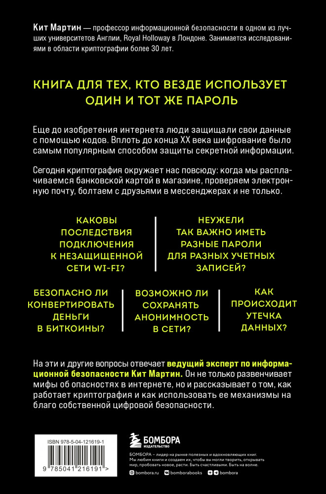 💳 Оплатить за товар можно при получении 🇰🇿 Есть бесплатная доставка по Казахстану 🎁 Копите бонусы с каждой покупки Серия: КиберБез. Лучшие книги о безопасности в сети Еще до изобретения интернета люди защищали свои данные с помощью кодов. Вплоть до конца XX века шифрование было самым популярным способом защиты секретной информации. Сегодня криптография окружает нас повсюду: когда мы расплачиваемся банковской картой в магазине, проверяем электронную почту, болтаем с друзьями в мессенджерах и не только. |