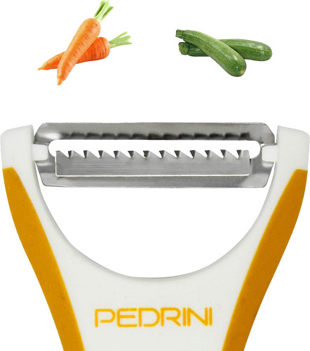 Pedrini ОвощечисткаВ данный момент этот товар отсутствует в продаже. Возможно, у нас найдется аналогичный или похожий товар здесь. Серия: Lillo Gadget Пластиковая овощечистка Pedrini с резиновыми кромками и острым качающимся лезвием из нержавеющей стали. Идеально подходит для картофеля, кабачков, баклажанов, спаржи и овощей. Практичные материалы гарантируют простой уход и долгий срок службы. Благодаря эргономичной форме овощечистка удобно сидит в руке.  |