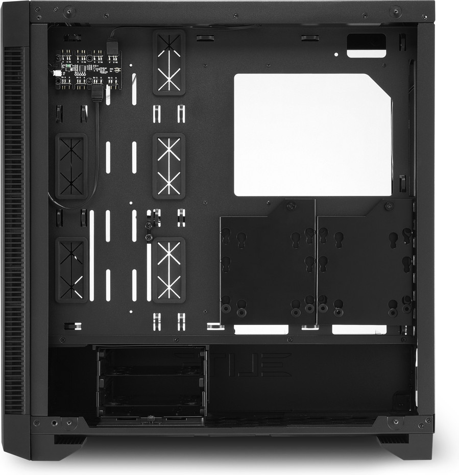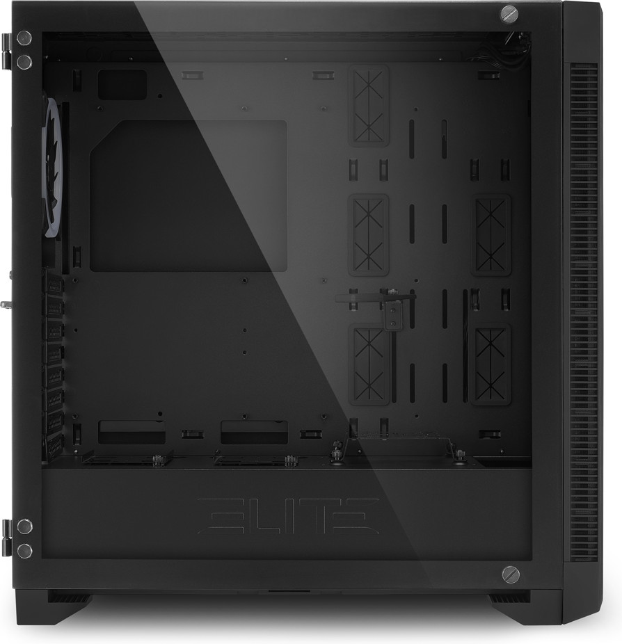 Внутренняя отделка корпуса может быть продемонстрирована через большую боковую панель из закаленного стекла. Откидная боковая панель обеспечивает быстрый доступ к оборудованию и повышает качество пользования. Сетчатый элемент на передней панели сочетает в себе практичность и элегантность, что позволяет увеличить скорость воздушного потока благодаря его воздухопроницаемой структуре. Большой фильтр обеспечивает защиту оборудования.