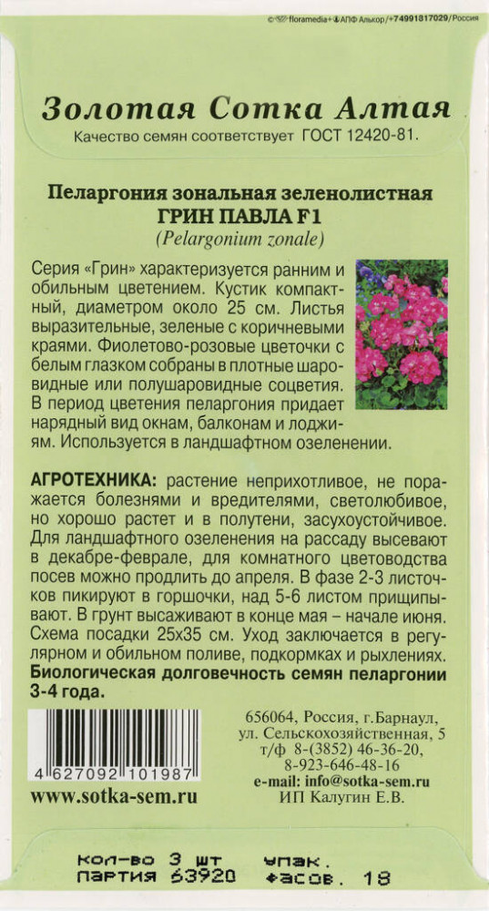 | Золотая сотка Алтая Пеларгония «Грин Павла F1»