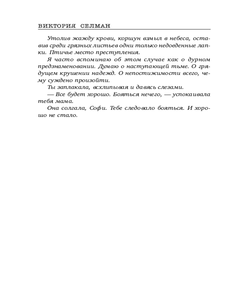 "От самого тёмного сердца" (В. Селман) книга в твёрдом красивом переплёте, страницы белые, шрифт чёткий. Содержание напоминает, более всего, не детектив, с его загадками и способами разрешения, а биографическое описание маньяка Мэтти Мелгрена. Поэтому эта книга, скорее, психологический триллер, но не детектив в полном его значении. Сразу всё понятно, кто убивает. Заключение в книге несколько "смазано", нет достаточной чёткости. Это мне не понравилось. Но - отлично показаны взаимоотношения Мэтти с семьёй Софи и Амелии-Роуз. Действительно, в историях жизни маньяков часто упоминается, что маньяк - хороший семьянин (например, Чикатило). Поэтому, не несмотря на то, что детектив загадкой не является, учитывая отличное описание психологических аспектов, ставлю пять.