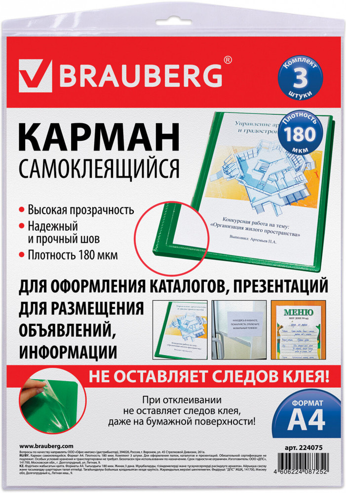 Brauberg Комплект карманов самоклеящихся на любую поверхность-20% +50 клейкость полезность универсальность крепления