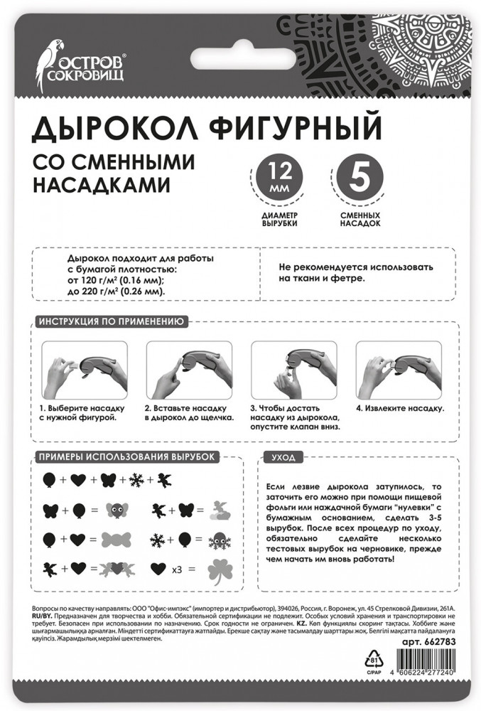 Вырубки можно использовать совместно для создания других интересных рисунков. Подробная инструкция размещена на обратной стороне упаковки. Диаметр вырубки составляет 12 мм, вырубленные элементы могут быть использованы в качестве конфетти. Дырокол надёжен, безопасен и прост в работе, может использоваться детьми и взрослыми. |