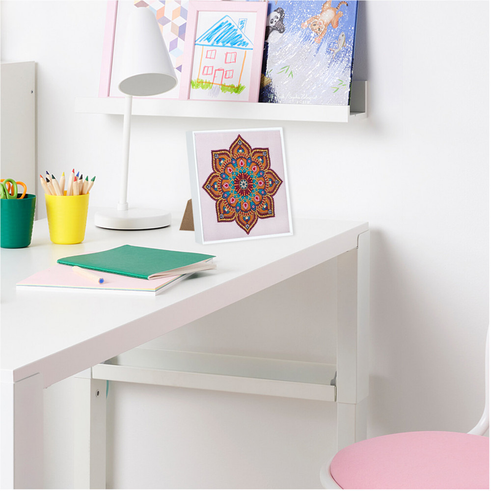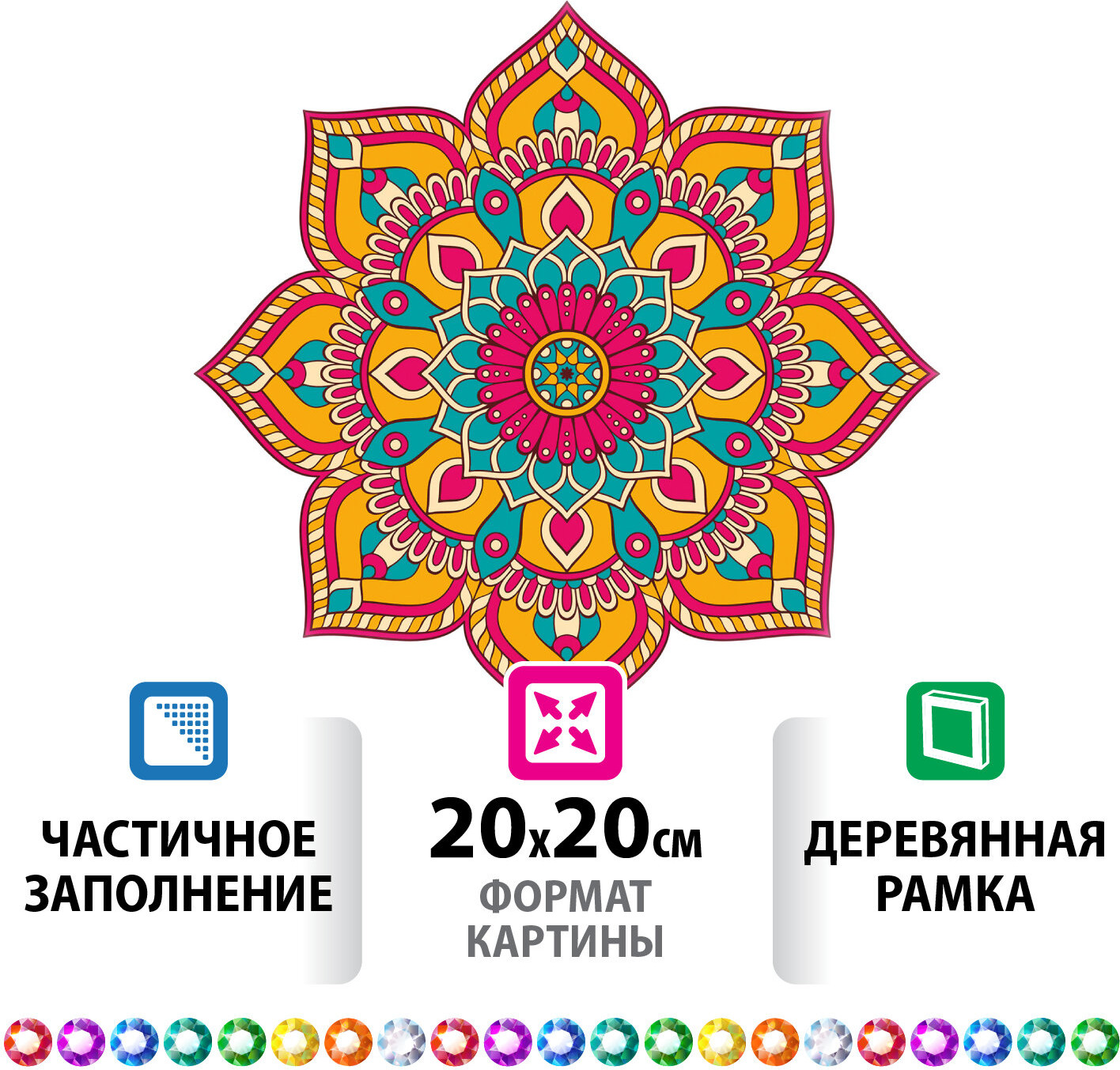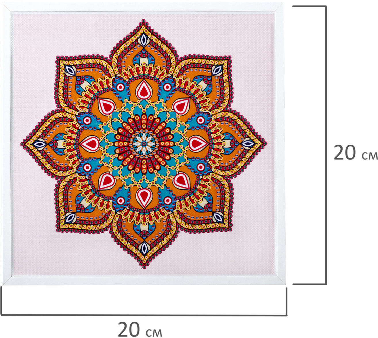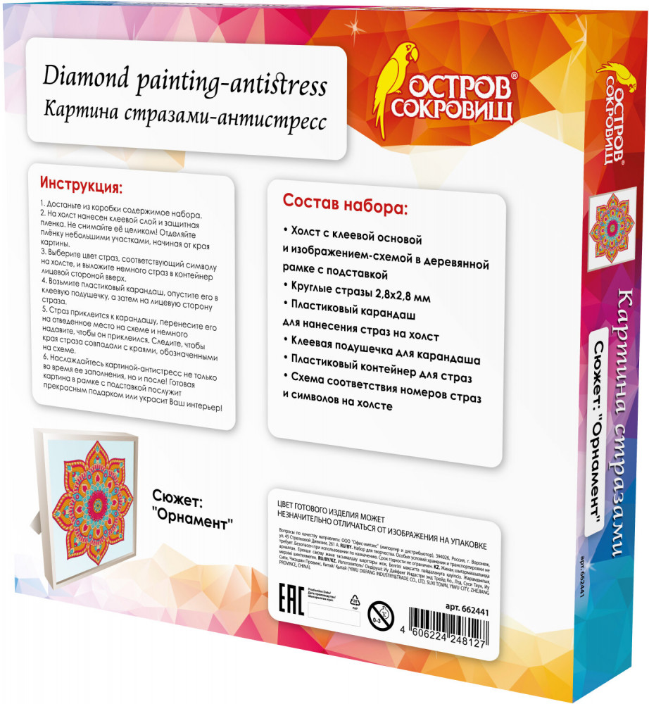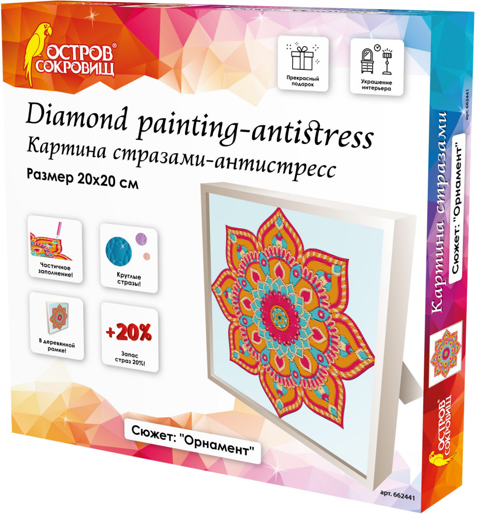 Размер готовой картины составляет 20×20 см. Картина частично заполняется сверкающими круглыми акриловыми стразами, напоминает по стилю раскраску-антистресс. Готовую работу можно поставить при помощи подставки или повесить на стену. Алмазная мозаика — прекрасное хобби, подходящее для терпеливых людей, ценящих красоту. Картины стразами «Остров сокровищ» — это широкий выбор сюжетов, отличный подарок, как в виде набора, так и в качестве готовой работы, которая послужит эффектным украшением любого интерьера!