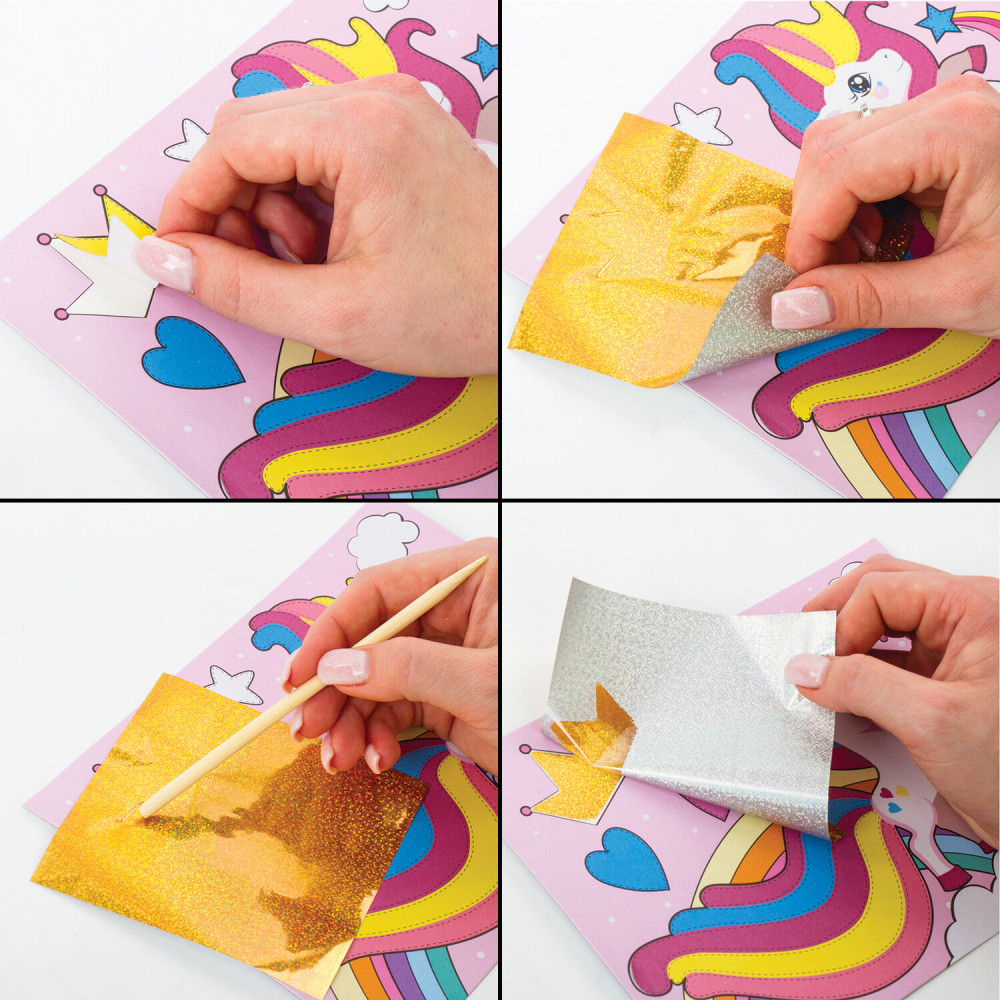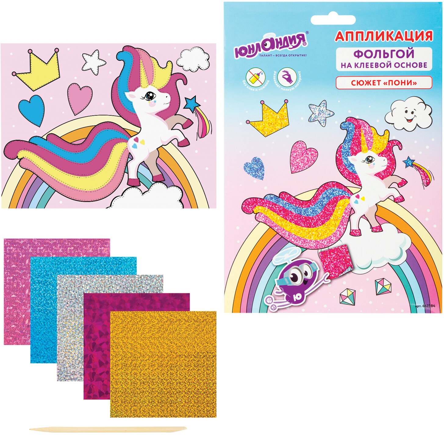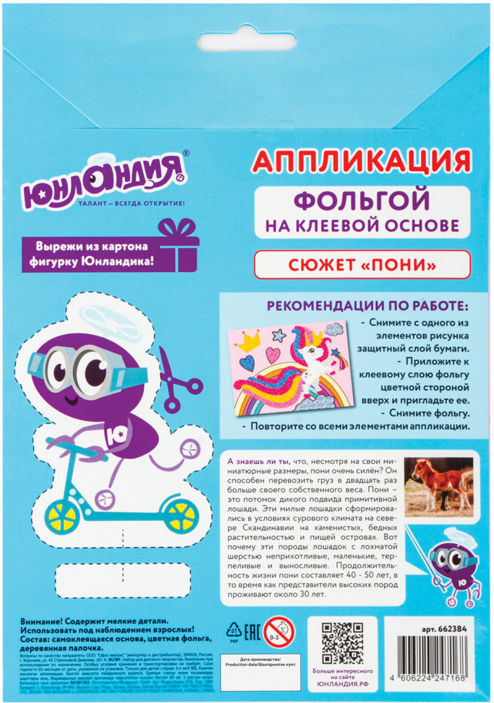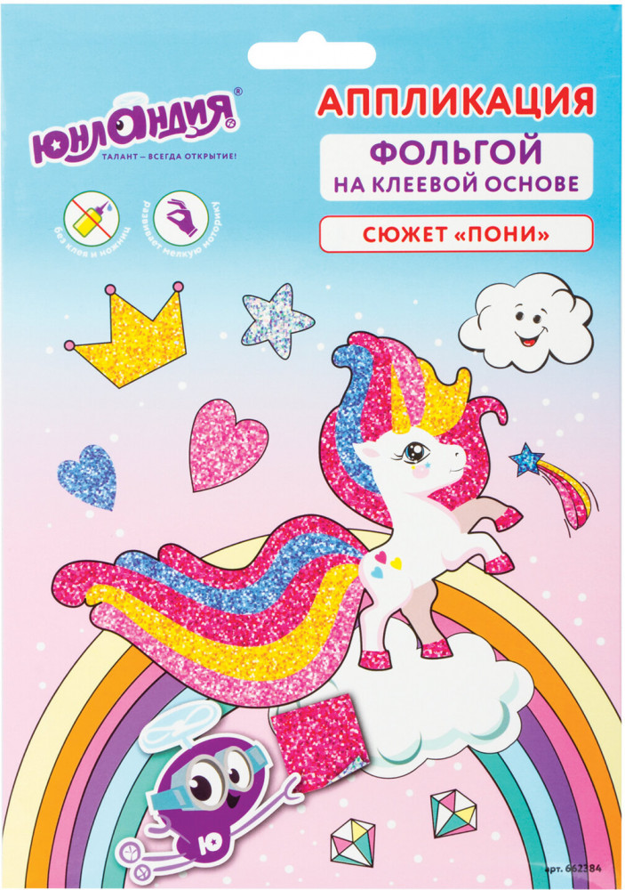 Аппликация из фольги — это интересный способ развития мелкой моторики, цветового восприятия и фантазии ребёнка, а также блестящая картина своими руками! Для создания аппликации не требуются ножницы и клей, все необходимые элементы входят в набор.В набор входит самоклеящаяся картонная основа размером 20×15 см с напечатанным дизайном аппликации, разработанным дизайнерами Юнландия специально для детей, покрытая защитным слоем бумаги с перфорацией по линиям рисунка, а также 5 листов волшебной фольги (плёнки ПЭТ) разных цветов. |