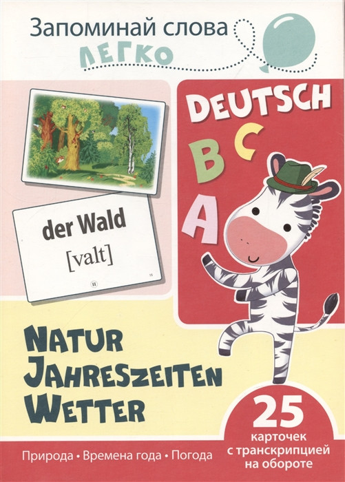 Серия: Запоминай слова легко Издательство «ТЦ Сфера» представляет комплект серии «Запоминай слова легко» под названием «Природа. Явления природы. Погода». Он состоит из 25 тематических карточек и адресован детям, желающим овладеть основами немецкого языка в игровой форме. |