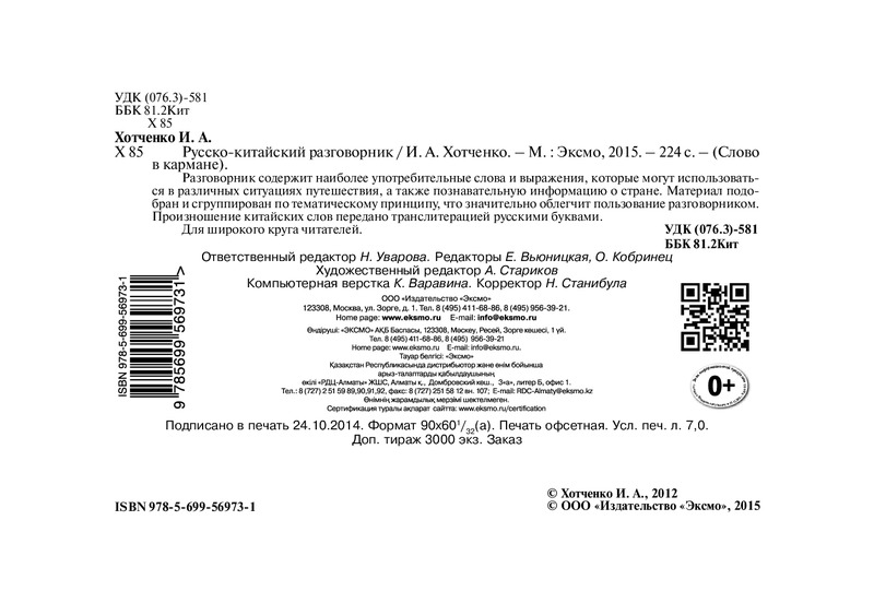 Русско-китайский разговорникВ данный момент этот товар отсутствует в продаже. Возможно, у нас найдется аналогичный или похожий товар здесь. Серия: Слово в кармане Разговорник содержит наиболее употребительные слова и выражения, которые могут использоваться в различных ситуациях путешествия, а также познавательную информацию о стране. Материал подобран и сгруппирован по тематическому принципу, что значительно облегчит пользование разговорником. Произношение китайских слов передано транслитерацией русскими буквами. |