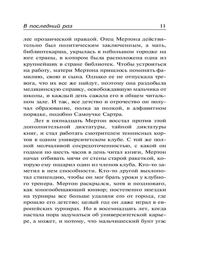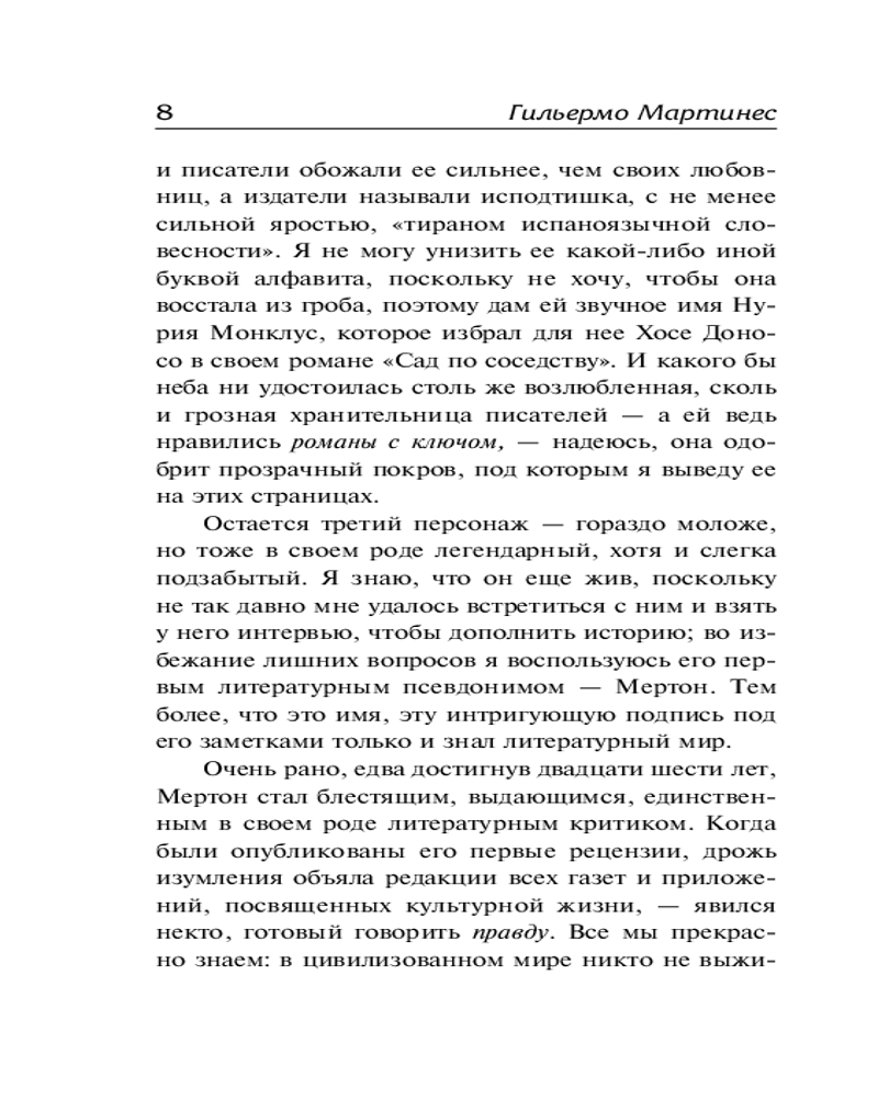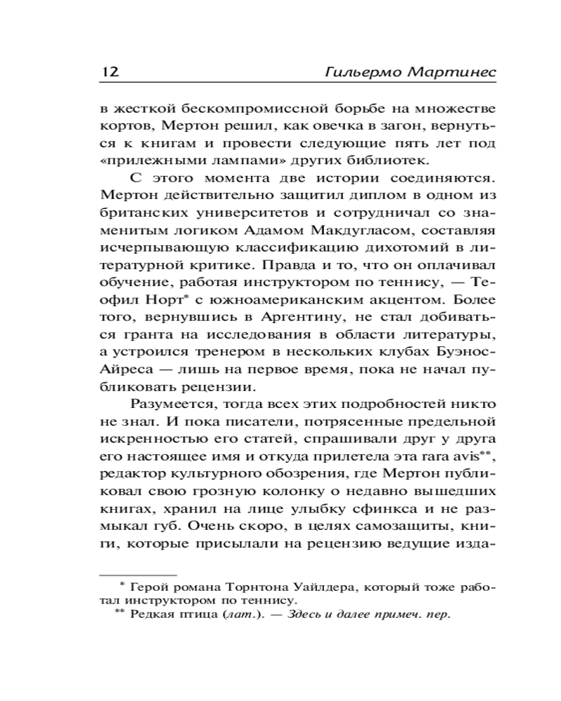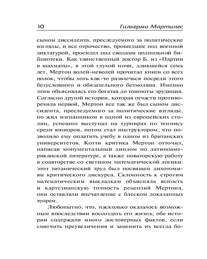 Серия: XX век / XXI век — The Best Инструктор по теннису Мертон, когда-то блестящий литературный критик, известный своей беспристрастностью, оригинальностью и честностью суждений, получает неожиданное и весьма лестное предложение. Он должен прибыть в Барселону, в поместье знаменитого писателя, чтобы прочитать и оценить его последнюю книгу. Тот убежден, что критики и публика смогли оценить лишь поверхностный слой его произведений. Литературный агент писателя назначает Мертону фантастический гонорар всего лишь за то, что тот прочитает книгу, и обещает удвоить его, если Мертон сможет разгадать ее истинный смысл. |