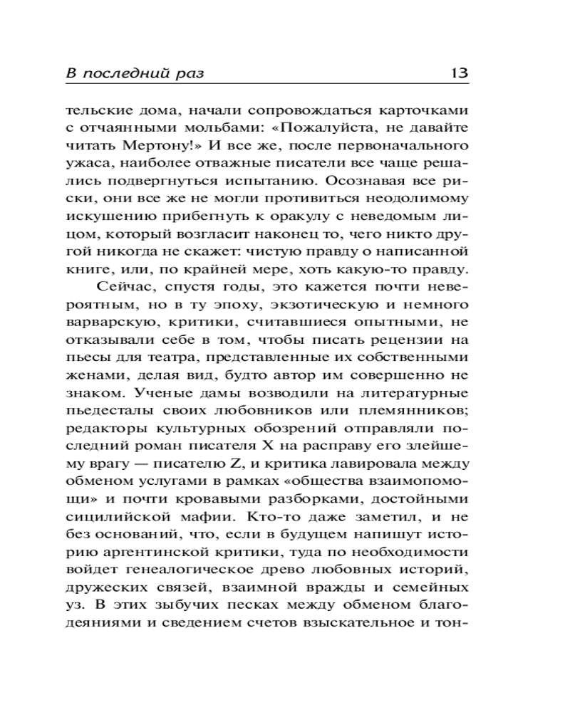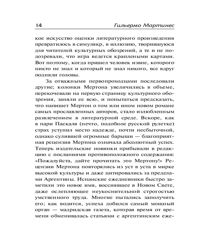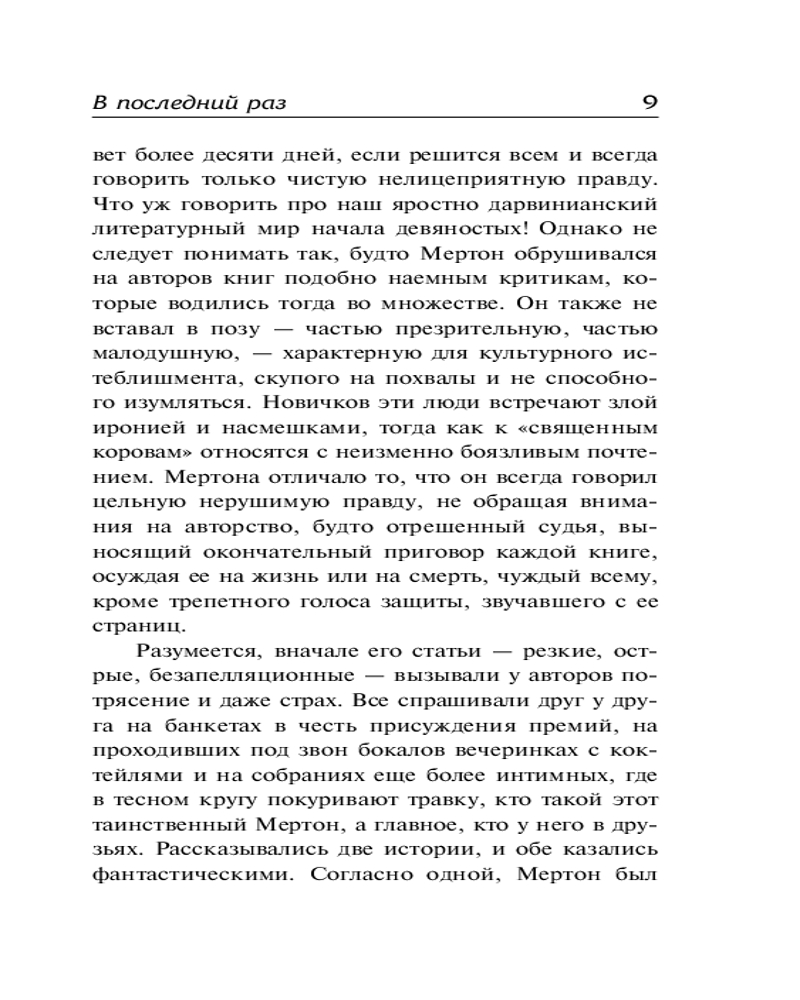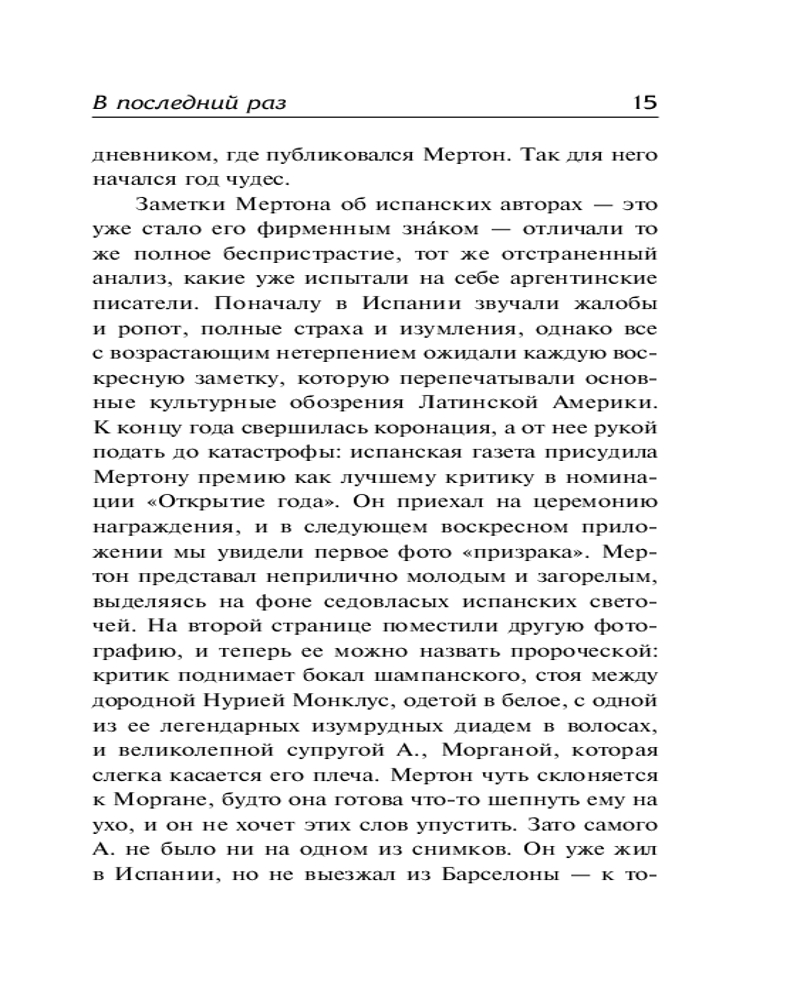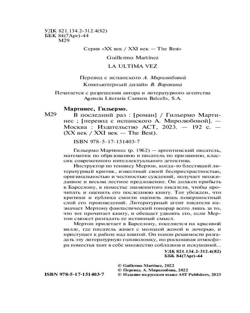 Серия: XX век / XXI век — The Best Инструктор по теннису Мертон, когда-то блестящий литературный критик, известный своей беспристрастностью, оригинальностью и честностью суждений, получает неожиданное и весьма лестное предложение. Он должен прибыть в Барселону, в поместье знаменитого писателя, чтобы прочитать и оценить его последнюю книгу. Тот убежден, что критики и публика смогли оценить лишь поверхностный слой его произведений. Литературный агент писателя назначает Мертону фантастический гонорар всего лишь за то, что тот прочитает книгу, и обещает удвоить его, если Мертон сможет разгадать ее истинный смысл. |