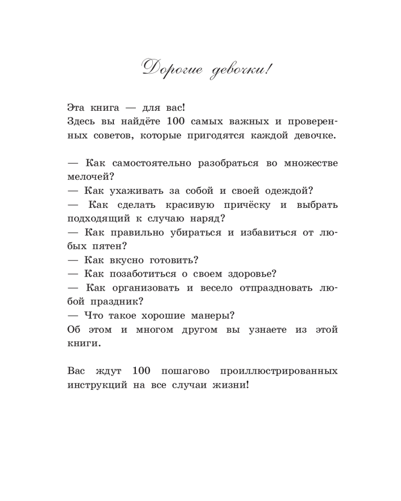 Серия: Самоучитель для детей «Всё, что должна уметь настоящая девочка» — это 100 самых важных и проверенных советов, которые пригодятся каждой девочке. Как самостоятельно разобраться во множестве мелочей? Как ухаживать за собой и своей одеждой? Как сделать красивую причёску и выбрать подходящий к случаю наряд? Как правильно убираться и избавиться от любых пятен? Как вкусно готовить? Как позаботиться о своем здоровье? Как организовать и весело отпраздновать любой праздник? Что такое хорошие манеры? Об этом и многом девочки узнают из этой книги. Вас ждут 100 пошагово проиллюстрированных инструкций на все случаи жизни! |