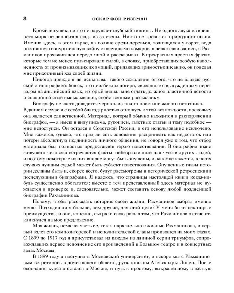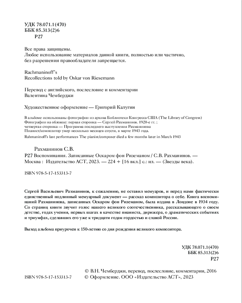 Серия: Звезды века Сергей Васильевич Рахманинов, к сожалению, не оставил мемуаров, и перед нами фактически единственный подлинный мемуарный документ — рассказ композитора о себе. Книга воспоминаний Рахманинова, записанных Оскаром фон Риземаном, была издана в Лондоне в 1934 году. Со страниц книги звучит голос нашего великого соотечественника, рассказывающего о своем детстве, годах учения, первых шагах в качестве пианиста, дирижера, о драматических событиях и триумфах, сделавших его уже к тридцати годам гордостью и славой России. Выход альбома приурочен к 150-летию со дня рождения великого композитора. |