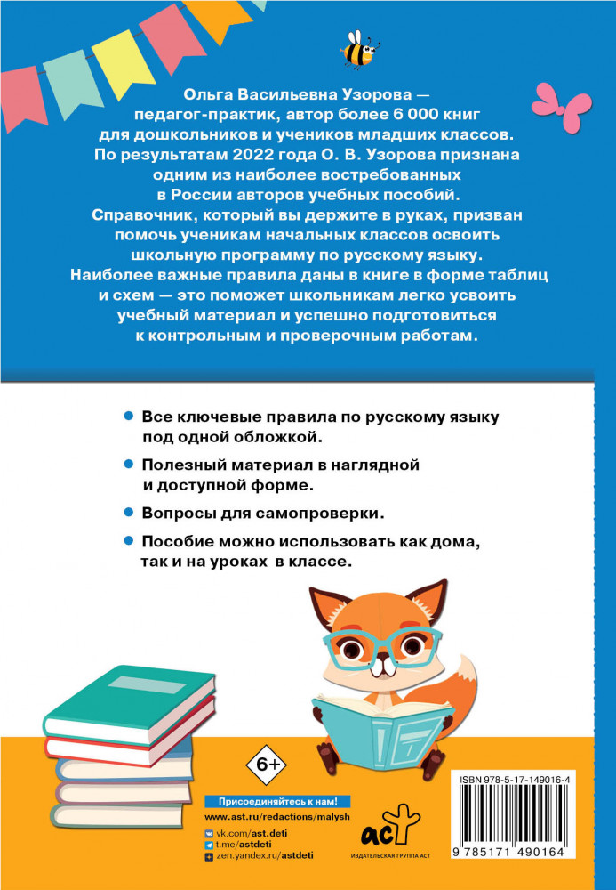 Серия: Справочник в цветных таблицах: просто и понятно «Русский язык. 1−4 классы» — это пособие по русскому языку для учащихся начальной школы, основанное на авторской методике известного педагога-практика О. В. Узоровой. Все правила по русскому языку даны в книге в виде цветных схем и таблиц. Учебный материал, представленный в табличной форме, нагляден и прост для понимания, а цветовое оформление облегчает запоминание информации и делает процесс обучения эффективным. Пособие поможет школьникам освоить наиболее трудные темы школьной программы и успешно подготовиться к контрольным и проверочным работам. |