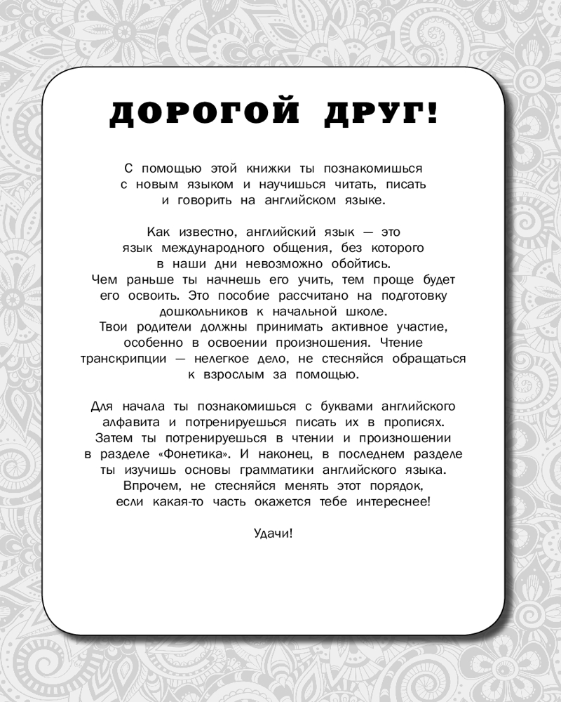 Английский язык: я учусь говорить, читать, писатьВ данный момент этот товар отсутствует в продаже. Возможно, у нас найдется аналогичный или похожий товар здесь. Серия: Готовимся к школе за 3 месяца Школа уже близко, а ребенок не знает английского? Вам поможет серия «Готовимся к школе за 3 месяца»! Редакция «Лингва» подготовила эту книгу специально для занятий с детьми. Освоив эту книгу, ребенок без труда справится со школьной программой. Она включает в себя прописи, которые помогут ребенку научиться писать по-английски, |