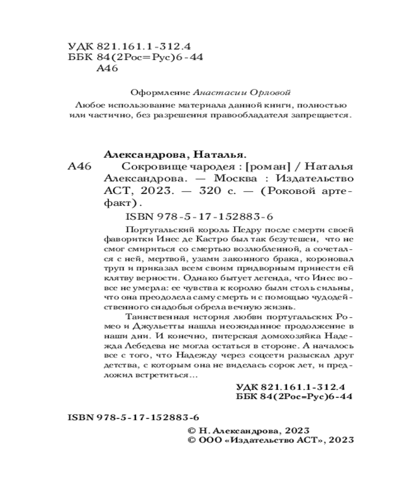 В данный момент этот товар отсутствует в продаже. Возможно, у нас найдется аналогичный или похожий товар здесь. Серия: Роковой артефакт (м) Португальский король Педру после смерти своей фаворитки Инес де Кастро был так безутешен, что не смог смириться со смертью возлюбленной, а сочетался с ней, мертвой, узами законного брака, короновал труп и приказал всем своим придворным принести ей клятву верности. Однако бытует легенда, что Инес вовсе не умерла: ее чувства к королю были столь сильны, что она преодолела саму смерть и с помощью чудодейственного снадобья обрела вечную жизнь.