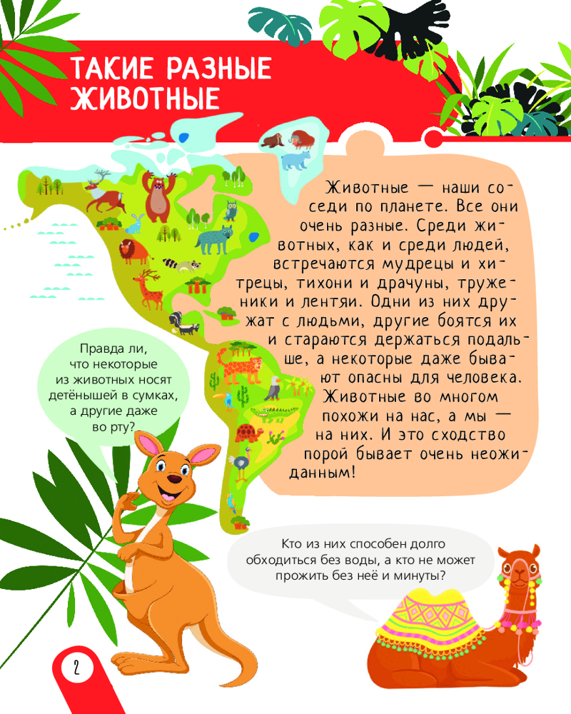 Почему одни животные могут долго обходиться без воды, а другим она, наоборот, жизненно необходима? Для чего носорогу нужен рог, а моржам — огромные клыки? Чьи детёныши рождаются почти самостоятельными, а каким ещё нужно подрасти в маминой сумке? У малышей возникает множество вопросов о наших соседях по планете, а ответы на них — в этой книге. Она написана очень интересно, понятным и доступным языком. Красочные иллюстрации приведут ребятишек в восторг: все животные, даже опасные хищники, изображены забавными и очень милыми! Итак, открывайте книгу — начинайте неповторимое путешествие в такой разнообразный мир животных! |