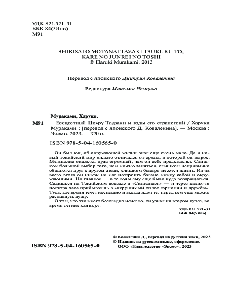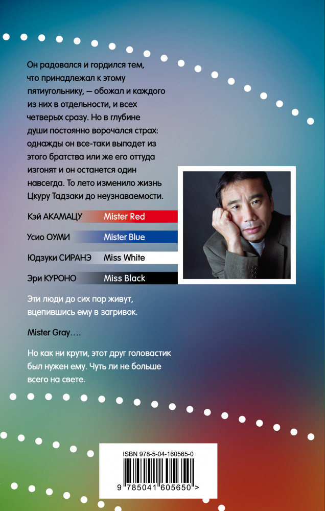 Бесцветный Цкуру Тадзаки и годы его странствийВ данный момент этот товар отсутствует в продаже. Возможно, у нас найдется аналогичный или похожий товар здесь. Серия: Миры Харуки Мураками Роман написан в жанре лирического реализма, к которому автор не возвращался с романа «Норвежский лес» (1987 г.). |