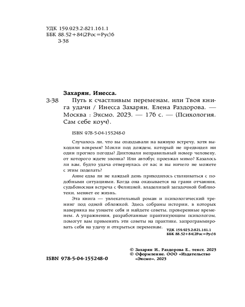 Путь к счастливым переменам, или Твоя книга удачиИнесса Захарян, Елена Раздорова В данный момент этот товар отсутствует в продаже. Возможно, у нас найдется аналогичный или похожий товар здесь. Серия: Психология. Cам себе коуч Случалось ли, что вы опаздывали на важную встречу, хотя выходили вовремя? Мокли под дождем, который не предвидел ни один прогноз погоды? Диктовали неправильный номер человеку, от которого ждете звонка? И казалось, будто удача отвернулась от вас и вы ничего не можете с этим поделать? Если да, то вам будет очень близка история Анны, героини этой книги, и вы наверняка найдете в ней много полезного для себя. И упражнения от практикующего психолога помогут вам справиться с чередой неудач. |