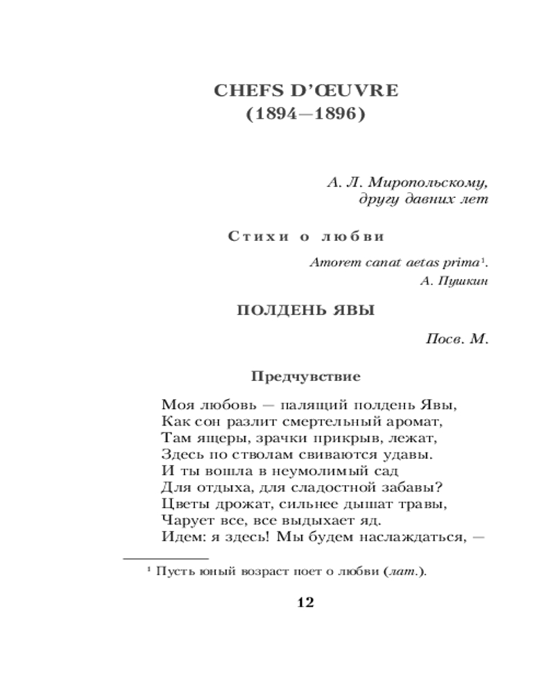 Серия: Золотая серия поэзии (новое оформление) Валерий Яковлевич Брюсов (1873–1924) — поэт, драматург и переводчик, основоположник русского символизма. В своем творчестве он часто обращался к событиям своей неспокойной эпохи, противопоставляя гениальное посредственному и воспевая человека как творца и созидателя. Поэзии Брюсова присущи все главные элементы символизма — экспериментаторство, таинственность, намеки и недосказанность. |
