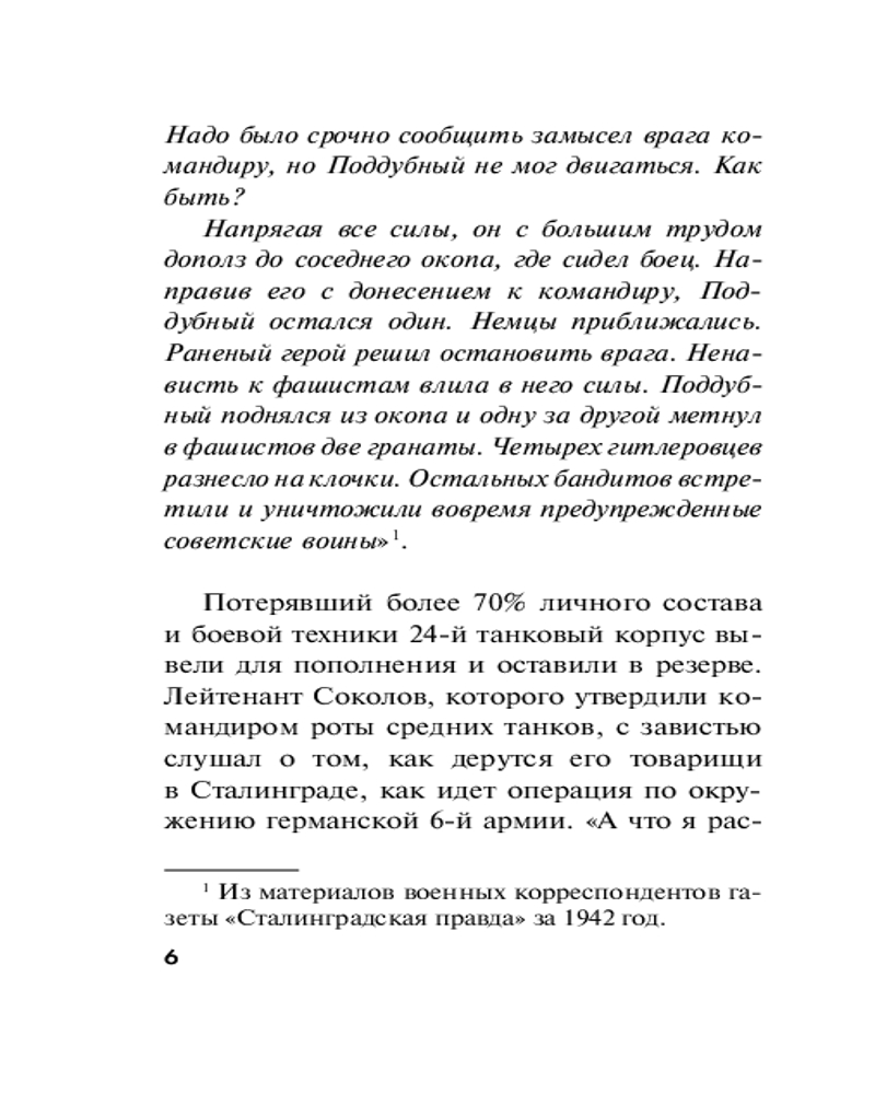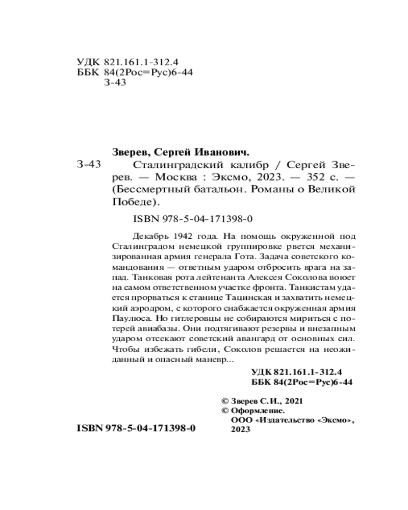 Серия: Бессмертный батальон. Романы о Великой Победе (обложка) Декабрь 1942 года. На помощь окруженной под Сталинградом немецкой группировке рвется механизированная армия генерала Гота. Задача советского командования — ответным ударом отбросить врага на запад. Танковая рота лейтенанта Алексея Соколова воюет на самом ответственном участке фронта. Танкистам удается прорваться к станице Тацинская и захватить немецкий аэродром, с которого снабжается окруженная армия Паулюса. Но гитлеровцы не собираются мириться с потерей авиабазы. Они подтягивают резервы и внезапным ударом отсекают советский авангард от основных сил. Чтобы избежать гибели, Соколов решается на неожиданный и опасный маневр... |