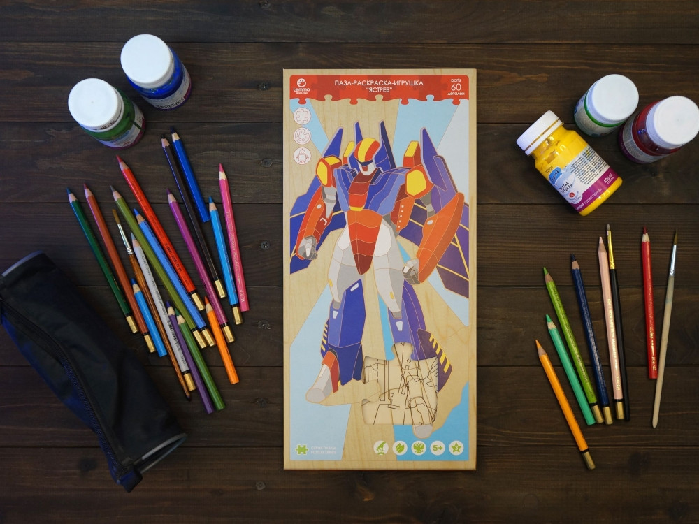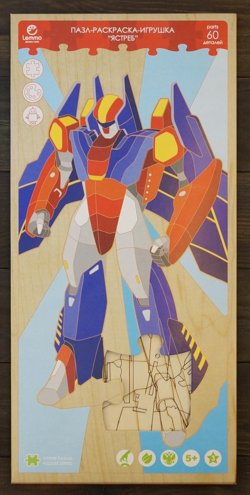Lemmo Пазл-раскраска-конструктор «Трансформер ястреб»В данный момент этот товар отсутствует в продаже. Возможно, у нас найдется аналогичный или похожий товар здесь. Серия: Пазлы и головоломки Новая серия деревянных развивающих пазлов для детей от компании «Lemmo». Развивающая игра «Трансформер ястреб» — это не только деревянный пазл, но и красивая раскраска из дерева, а также сборная модель и деревянный конструктор. Пазл поставляется со скрепленными деталями, который вы можете раскрасить, потом выдавить детали и собрать замечательную модельку. У собранной модели трансформера двигаются руки, ноги и превращается из робота в самолет. |