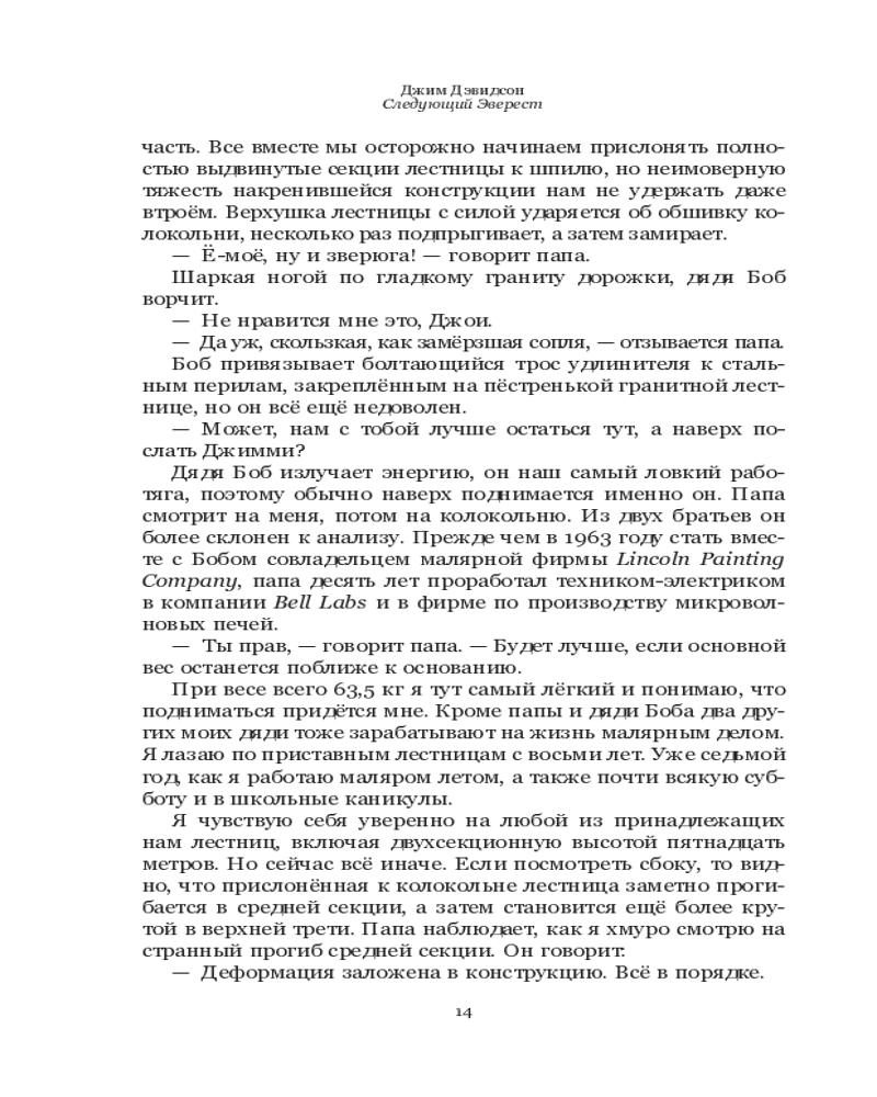 Серия: Выжить в апокалипсисе. Истории преодоления Джим Дэвидсон — опытный альпинист, мотивационный оратор и соавтор книги «Карниз», бестселлера по версии New York Times. Вместе со своими товарищами по команде он дважды получал благодарность от Службы национальных парков США за добровольное участие в опасных спасательных операциях в удаленных горных районах. Дэвидсон дарит вдохновение людям на всей территории США и за рубежом, занимаясь своим профессиональным бизнес-проектом «Поговорим о приключениях». Дэвидсон с супругой живут в штате Колорадо, у них двое детей, обожающих приключения. |