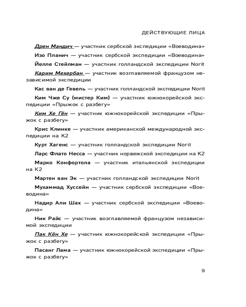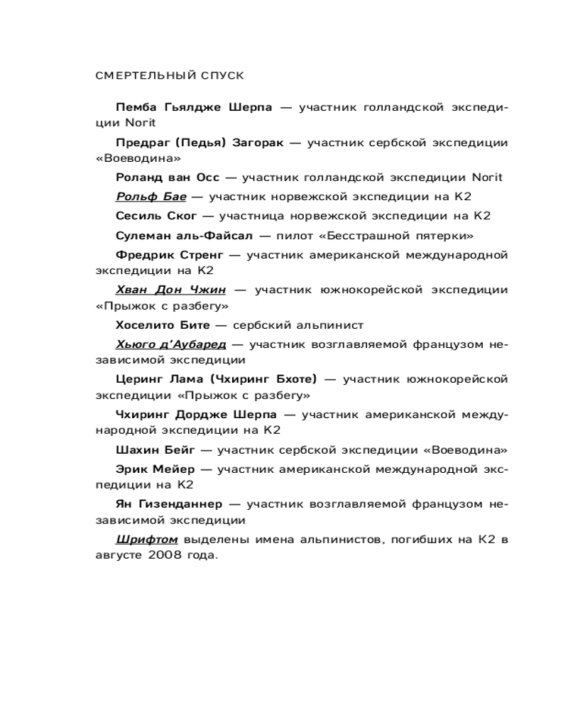 Книга дополнена биографиями известных альпинистов, историями о других попытках восхождения на К2 и мифологией региона.