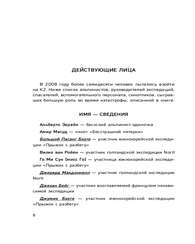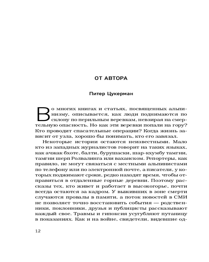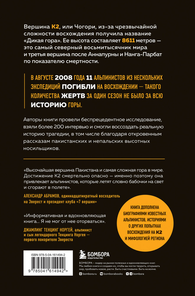 Авторы книги провели беспрецедентное исследование, взяли более 200 интервью и смогли воссоздать реальную историю трагедии, в том числе благодаря откровенным рассказам пакистанских и непальских высотных носильщиков.