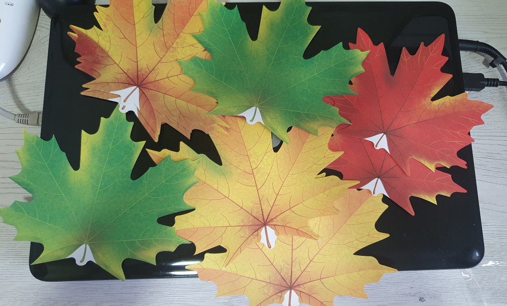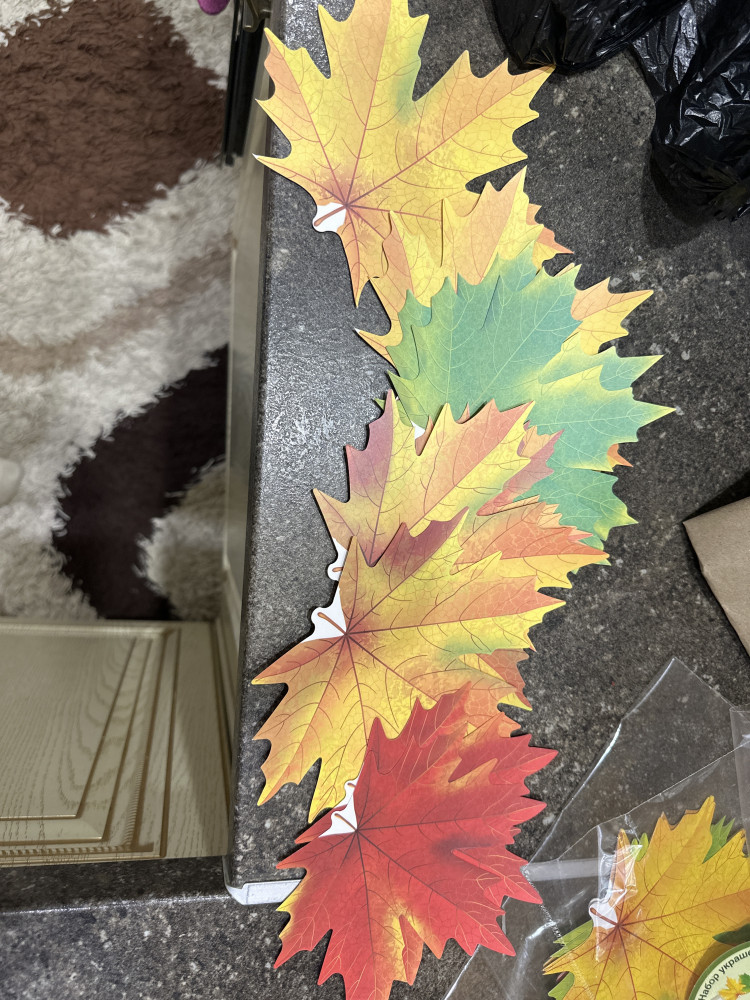 Очень хорошего качества украшения: яркие, крупные. В комплекте есть еще наклейки, с помощью которых можно приклеить эти листики