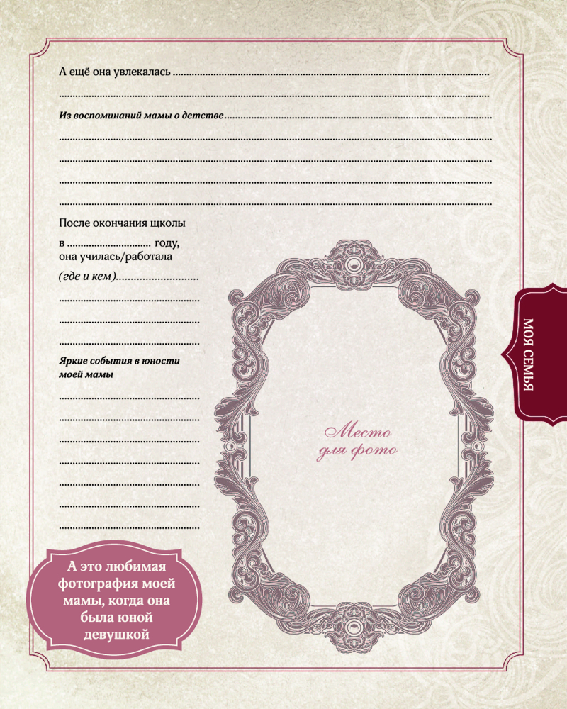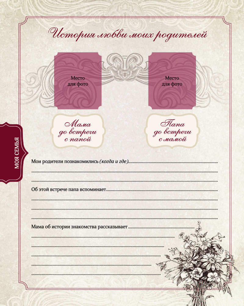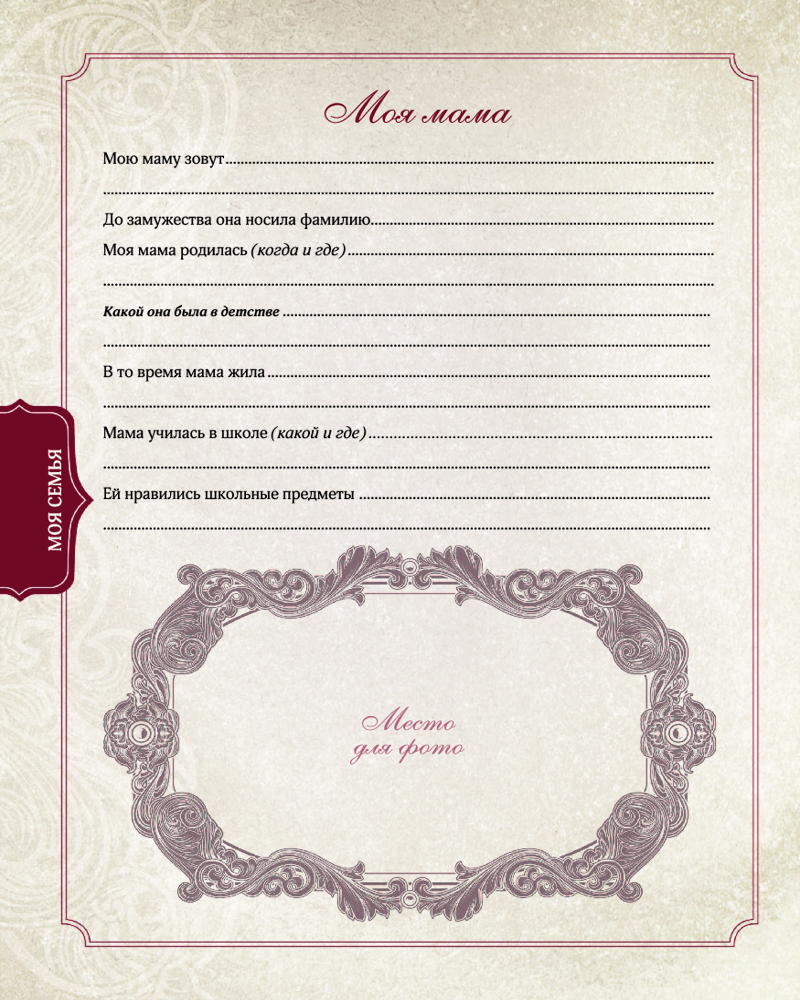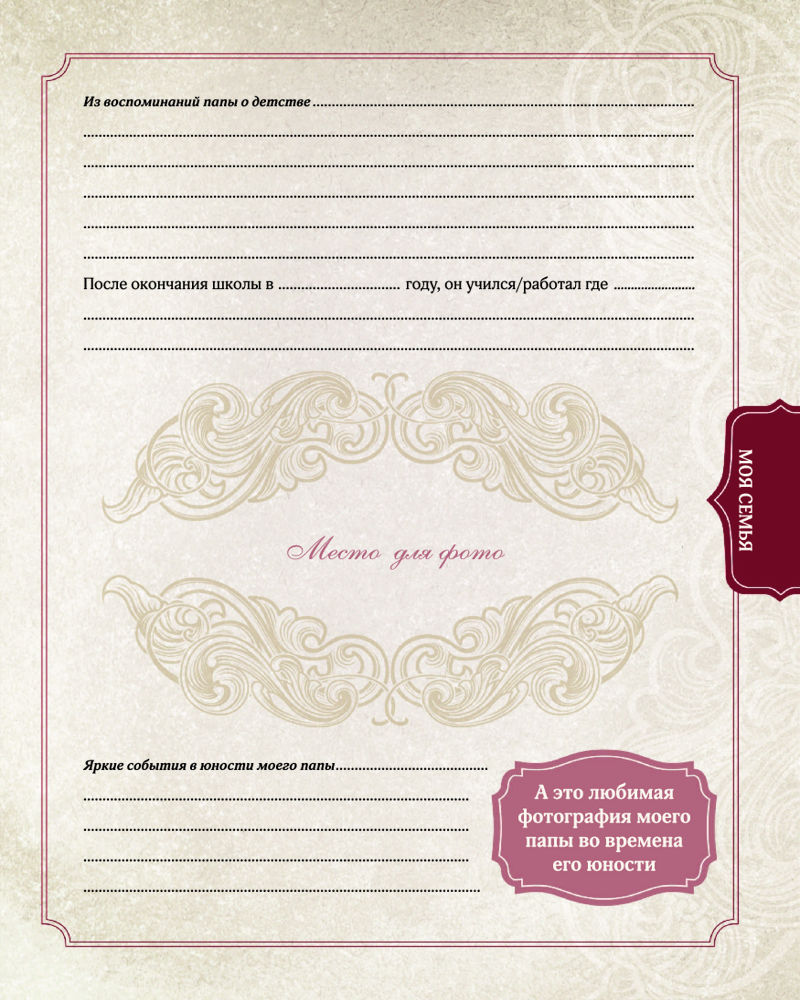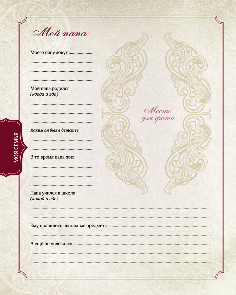 Родословная моей семьиВ данный момент этот товар отсутствует в продаже. Возможно, у нас найдется аналогичный или похожий товар здесь. Серия: Фотоальбом Этот альбом поможет тебе создать летопись своей семьи: на его страницах ты сумеешь разместить самую важную информацию, относящуюся к семейной родословной, и составить генеалогическое древо твоего рода. Сюда можно внести основные сведения и интересные факты о родственниках, их ценные воспоминания о себе и о времени, в котором они жили, а также собрать редкие снимки и документы. В альбоме найдётся место и для пересказа преданий и легенд, передаваемых в твоём роду из поколения в поколение, и для описания семейных традиций и реликвий, и для заполнения календаря памятных дат и значимых событий, и, конечно же, для многочисленных фотографий. Таким образом, ты положишь начало созданию уникального фамильного архива. А главное — эту книгу в будущем можно передать потомкам: детям, внукам и правнукам. Чтобы они помнили и продолжали взращивать фамильное древо. |