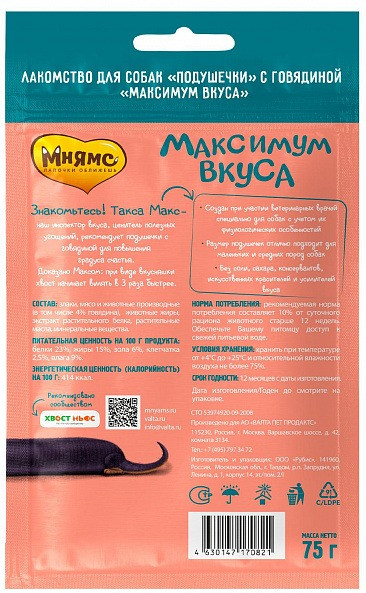 Мнямс Подушечки для собак с говядиной «Максимум вкуса»