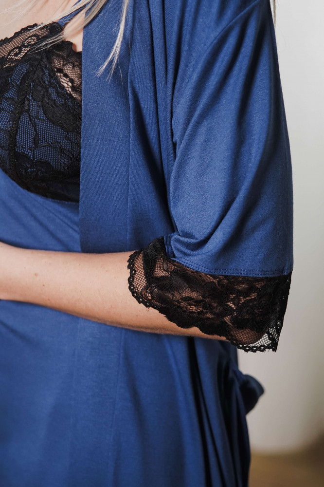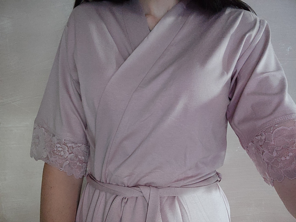 Красивый халат. Материал очень приятен к телу. Качество пошива и гипюра на рукавах хорошее. Если хотите чтобы был посвободнее, берите на размер больше своего. Я ношу 44 рр, взяла 46, хорошо сидит.