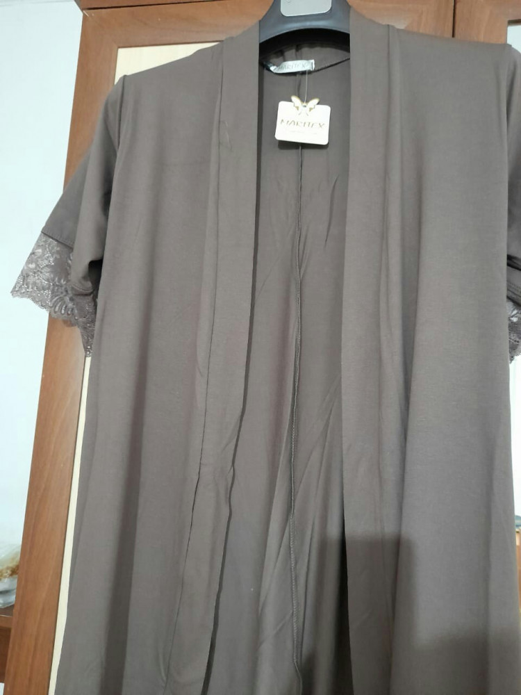 Халат легкий к телу приятный, брала цвет перец, запах действительно маленький и при движении все время открывается.