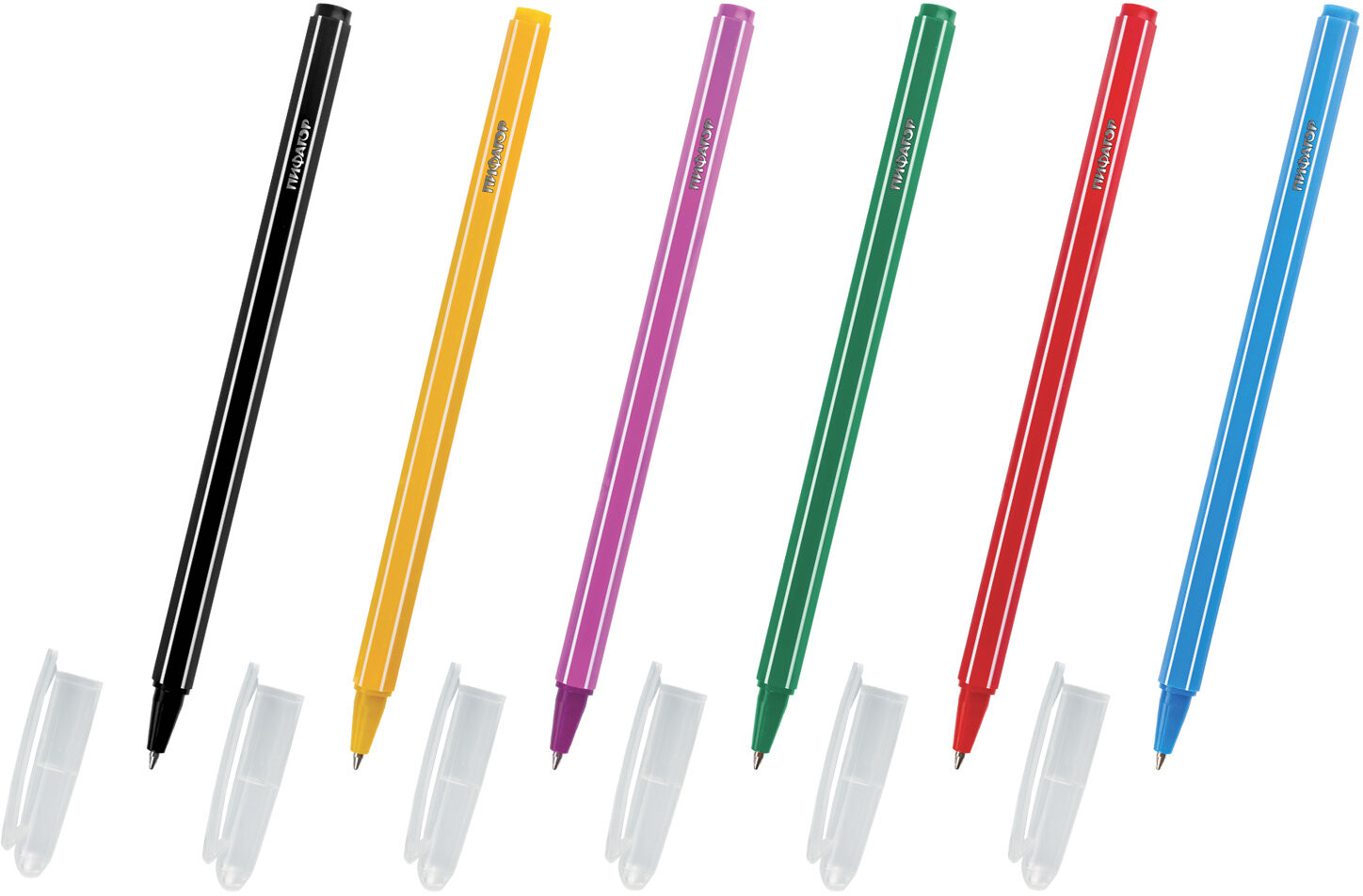 Удобные ручки с шестигранным корпусом красивого цвета. Цвет корпуса соответствует цвету чернил (чёрный, жёлтый, зелёный, розовый, красный). Создает тонкую, равномерную, непрерывную линию письма.