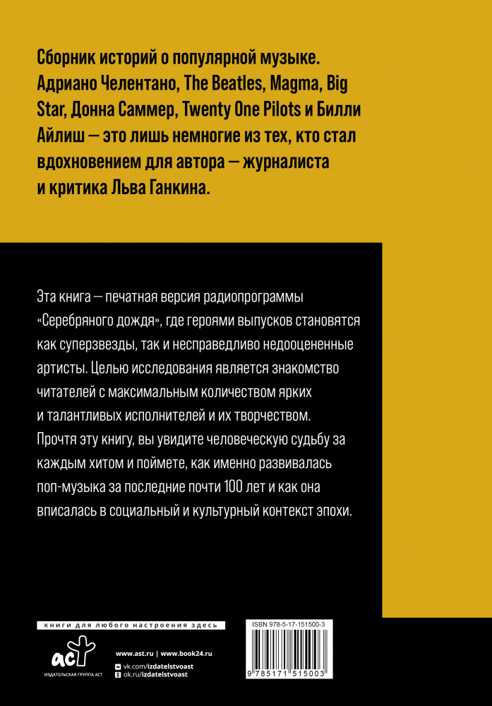 Серия: Music Legends & Idols Сборник историй о популярной музыке. Адриано Челентано, The Beatles, Magma, Big Star, Донна Саммер, Twenty One Pilots и Билли Айлиш — это лишь немногие из тех, кто стал вдохновением для автора — журналиста и критика Льва Ганкина. |
