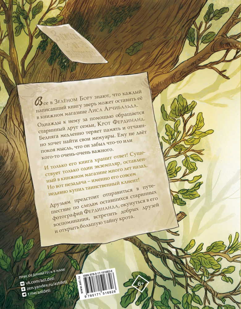 💳 Оплатить за товар можно при получении 🇰🇿 Есть бесплатная доставка по Казахстану 🎁 Копите бонусы с каждой покупки Серия: Любимые истории для детей Все в Зелёном Бору знают, что каждый написавший книгу зверь может оставить её в книжном магазине Лиса Арчибальда. Однажды к нему за помощью обращается старинный друг семьи, Крот Фердинанд. Бедняга медленно теряет память и отчаянно хочет найти свои мемуары. Ему не даёт покоя мысль, что он забыл что-то или кого-то очень-очень важного. И только его книга хранит ответ! Существует только один экземпляр, оставленный в книжном магазине много лет назад. Но вот незадача — именно его совсем недавно купил таинственный клиент! Друзьям предстоит отправиться в путешествие по следам оставшихся старинных фотографий Фердинанда, окунуться в его воспоминания, встретить добрых друзей и открыть большую тайну крота. |