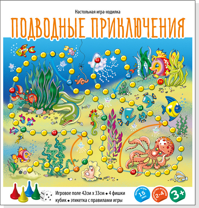 Игра настольная «Подводные приключения» — это путешествие в подводный мир для 2-4 игроков. Помогите маленькой рыбке добраться до мамы, ведь на ее пути полно опасностей: злой краб, пираньи и ядовитая медуза. Но у нее есть и друзья — ракушка-жемчужница и осьминог. Игра развивает воображение, дух соперничества, внимание.