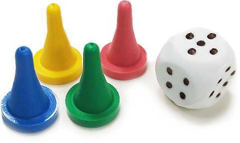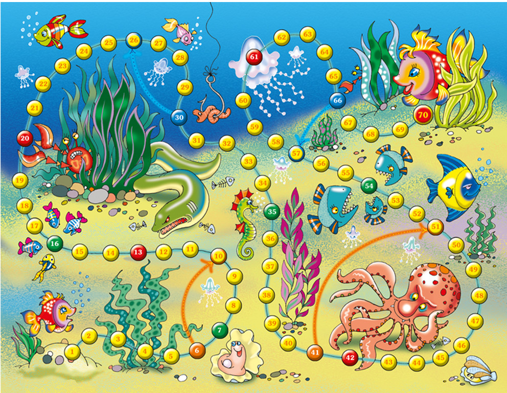 Правила игры: первый игрок кидает кубик и перемещается на выпавшее число шагов. Обратите внимание на кружки со стрелками и цветные кружки. Если игрок попадает на красный кружочек, то пропускает ход, если на зеленый — то получает дополнительный ход. После этого ход переходит к следующему игроку. Выигрывает тот игрок, который первым придет к финишу.