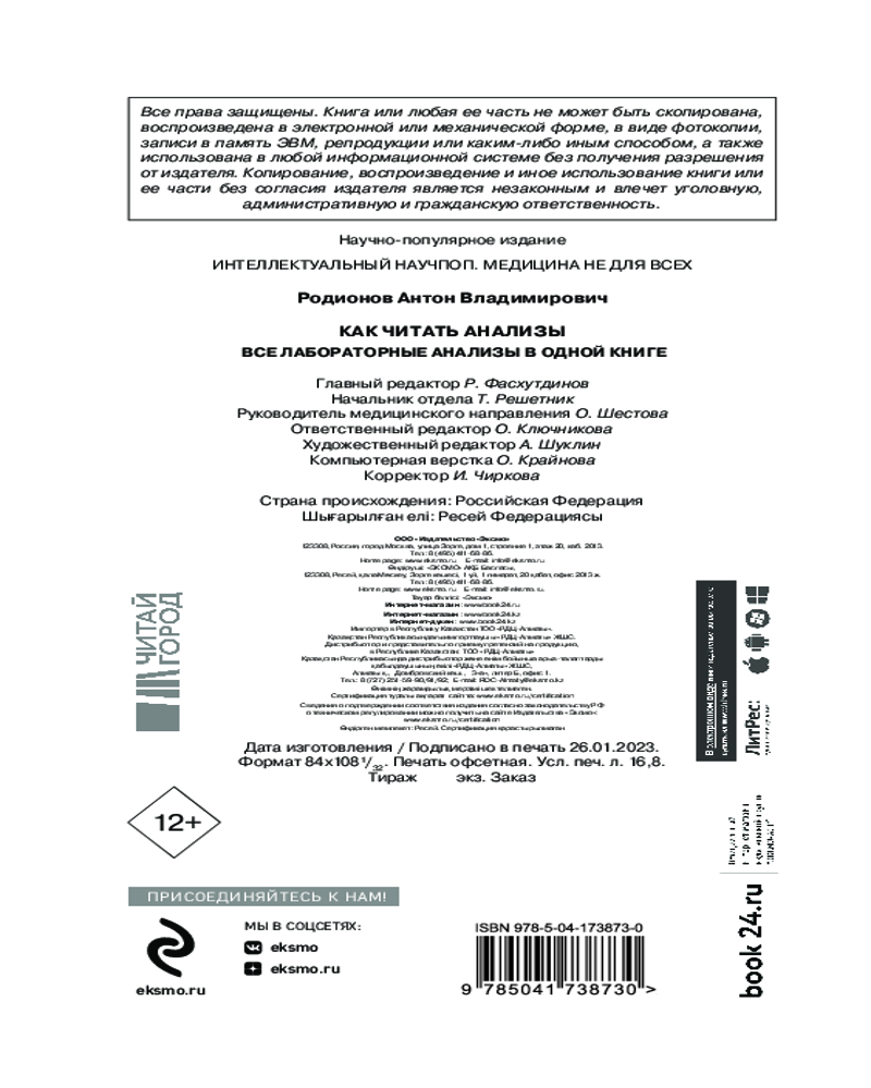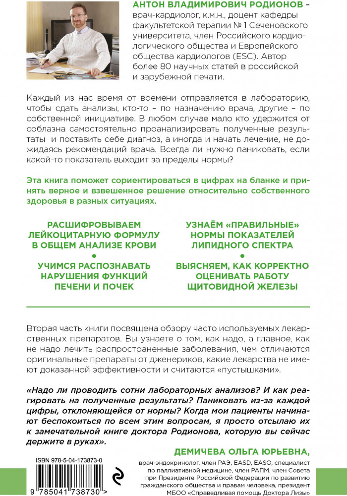 Серия: Практикум здоровья. Полезные книги от российских врачей Анализы крови, почечные и печеночные ферменты, гормоны, холестерин, онкомаркеры и еще более 10 других популярных исследований, которые мы часто проходим самостоятельно, а потом не можем расшифровать. Книга-помощник каждому, кто посещает лаборатории без назначения врача, а также тем, кто хочет понимать, почему доктор поставил тот или иной диагноз. |